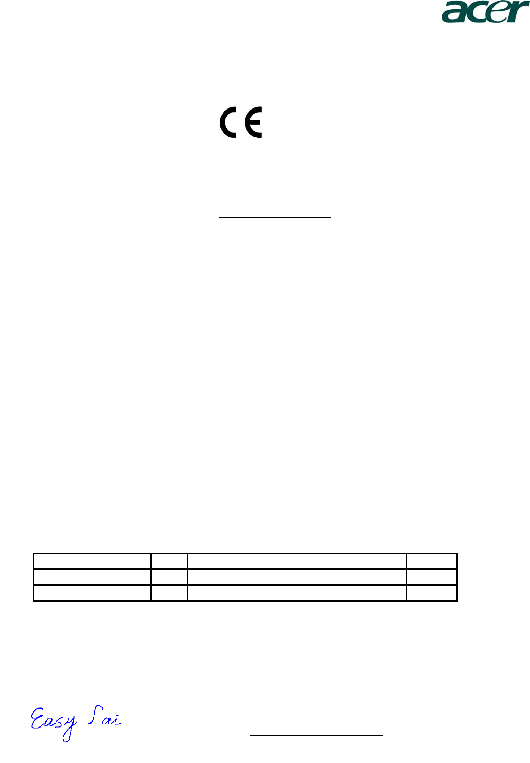 Contact Person: Mr. Easy Lai, E-mail: easy_lai@acer.com.tw