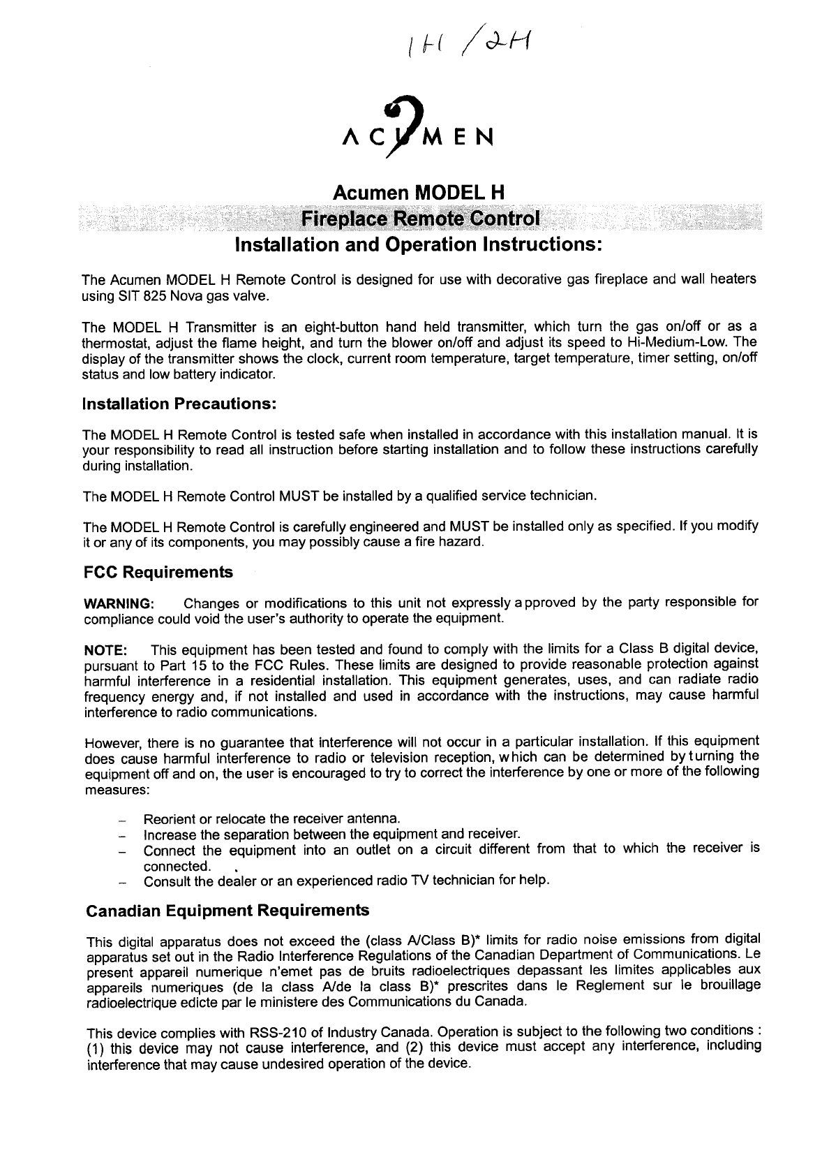 Acumen Technologies 1H05 350MHz Gas Fireplace Remote Transmitter User Manual