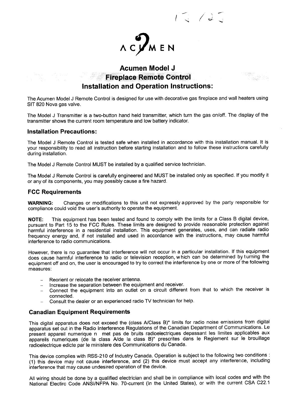 Acumen Technologies 1J05 350MHz Gas Fireplace Remote Transmitter User Manual