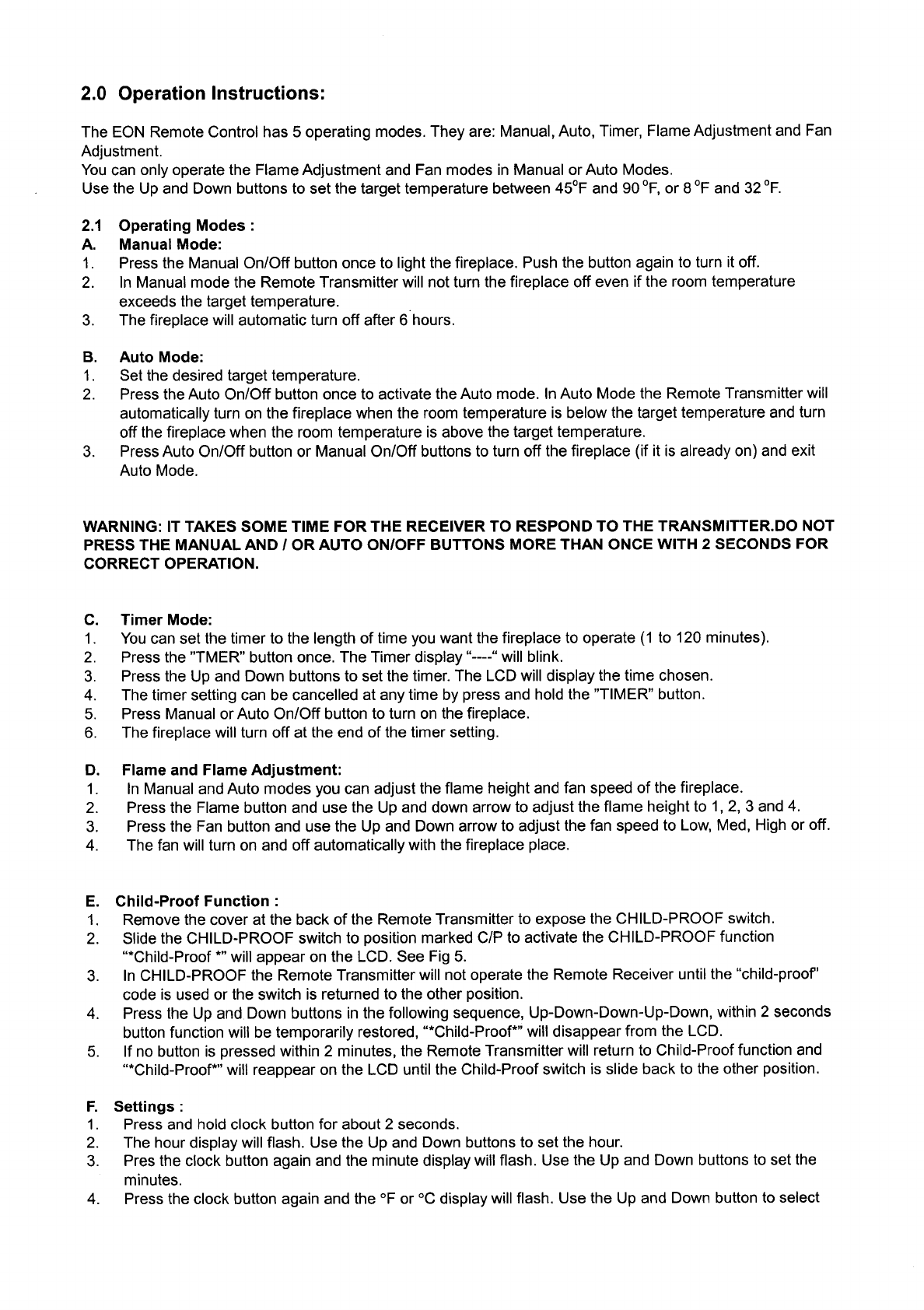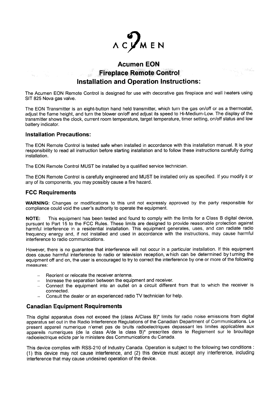 Acumen Technologies EON05 350MHz Gas Fireplace Remote Transmitter User Manual
