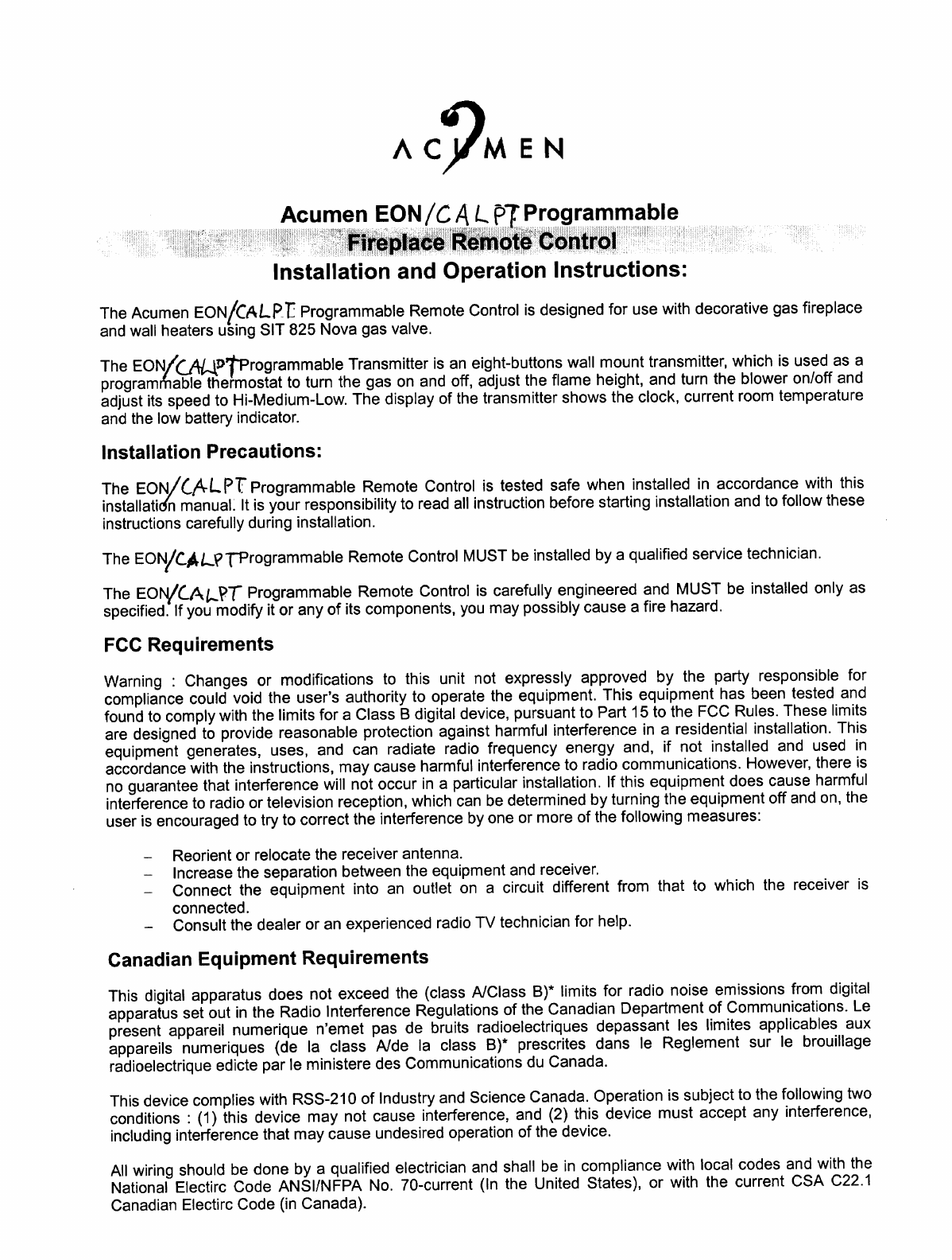 Acumen Technologies Ltd Wireless Fireplace Remote Control Manual