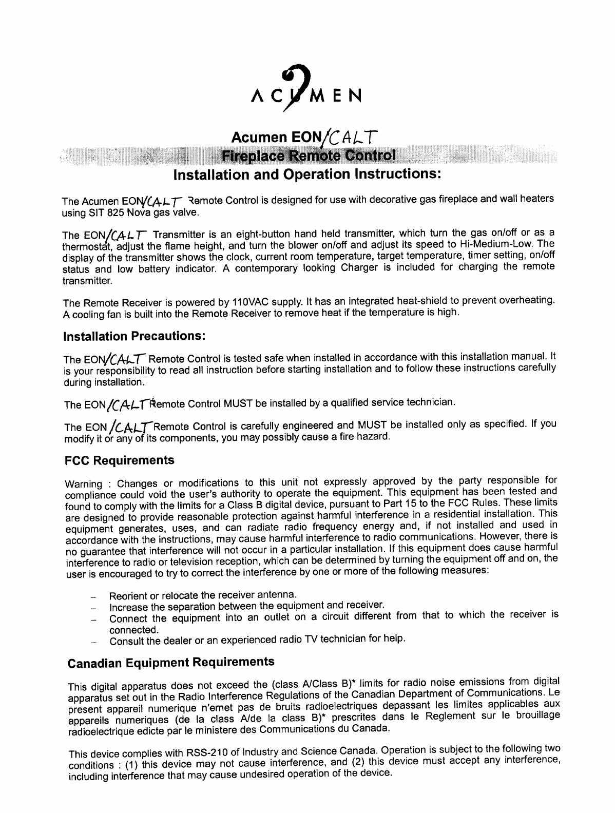 Acumen Technologies EONCLAT Wireless Fireplace Remote Control User Manual Manual
