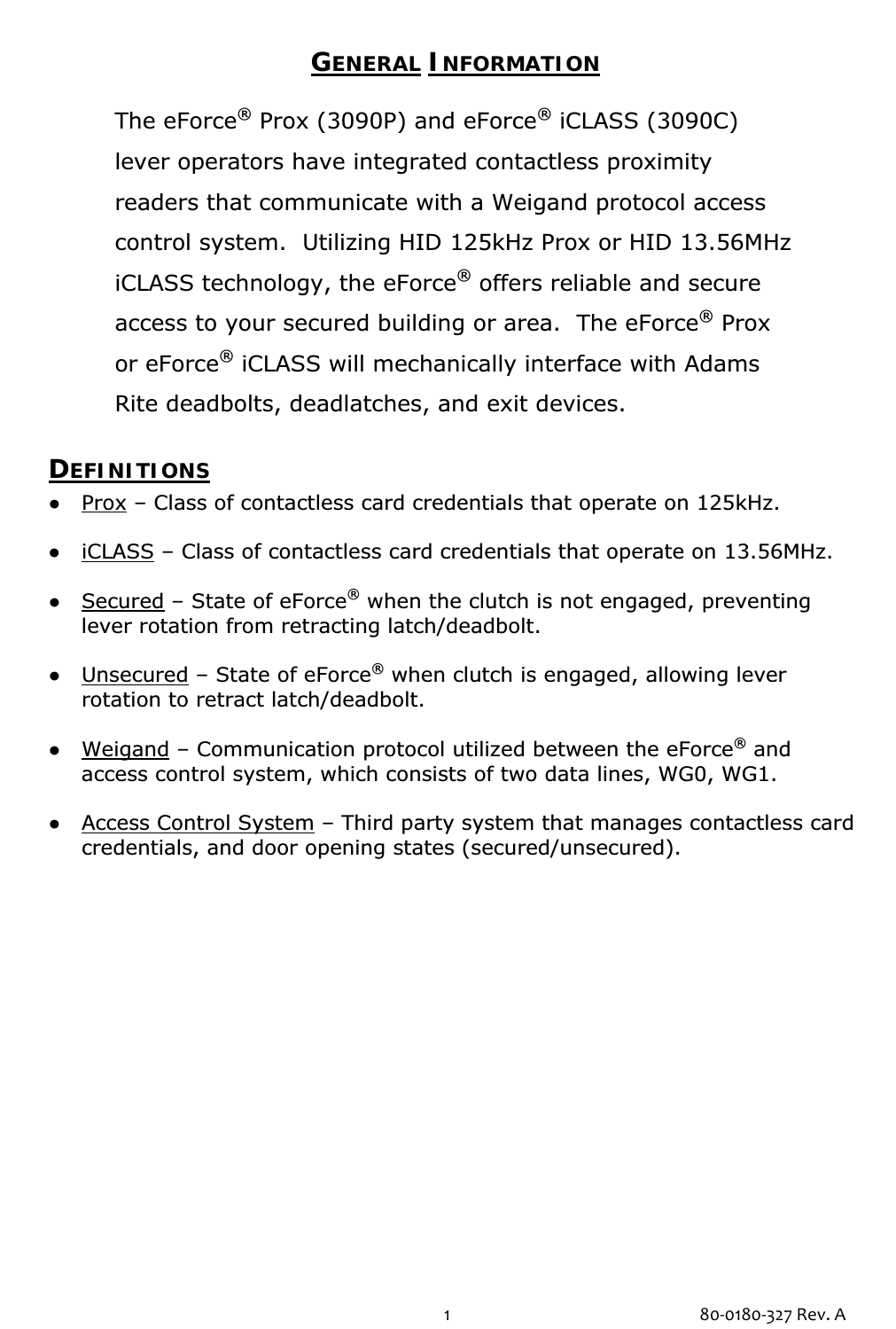 Adams Rite Manufacturing Co. eForce iCLASS Keyless Entry System NS OPERATOR