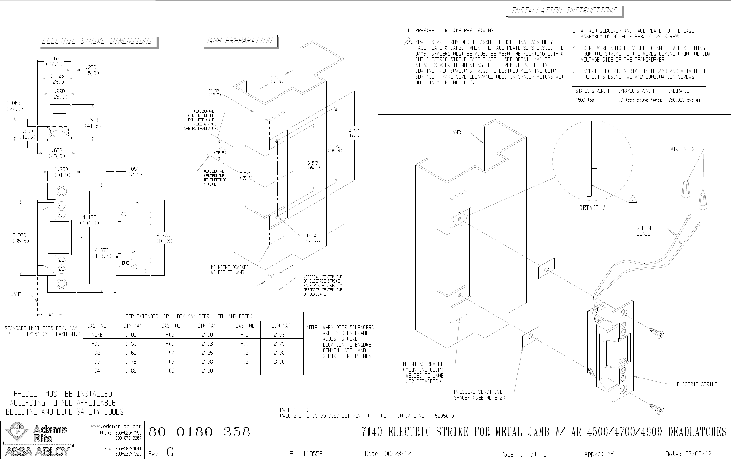 Adams Rite 7140 Electric Strike For Metal Jamb W/4500/4700 Deadlatches Installation Instructions ES7140 52050 0 80 0180 358 G 381 H