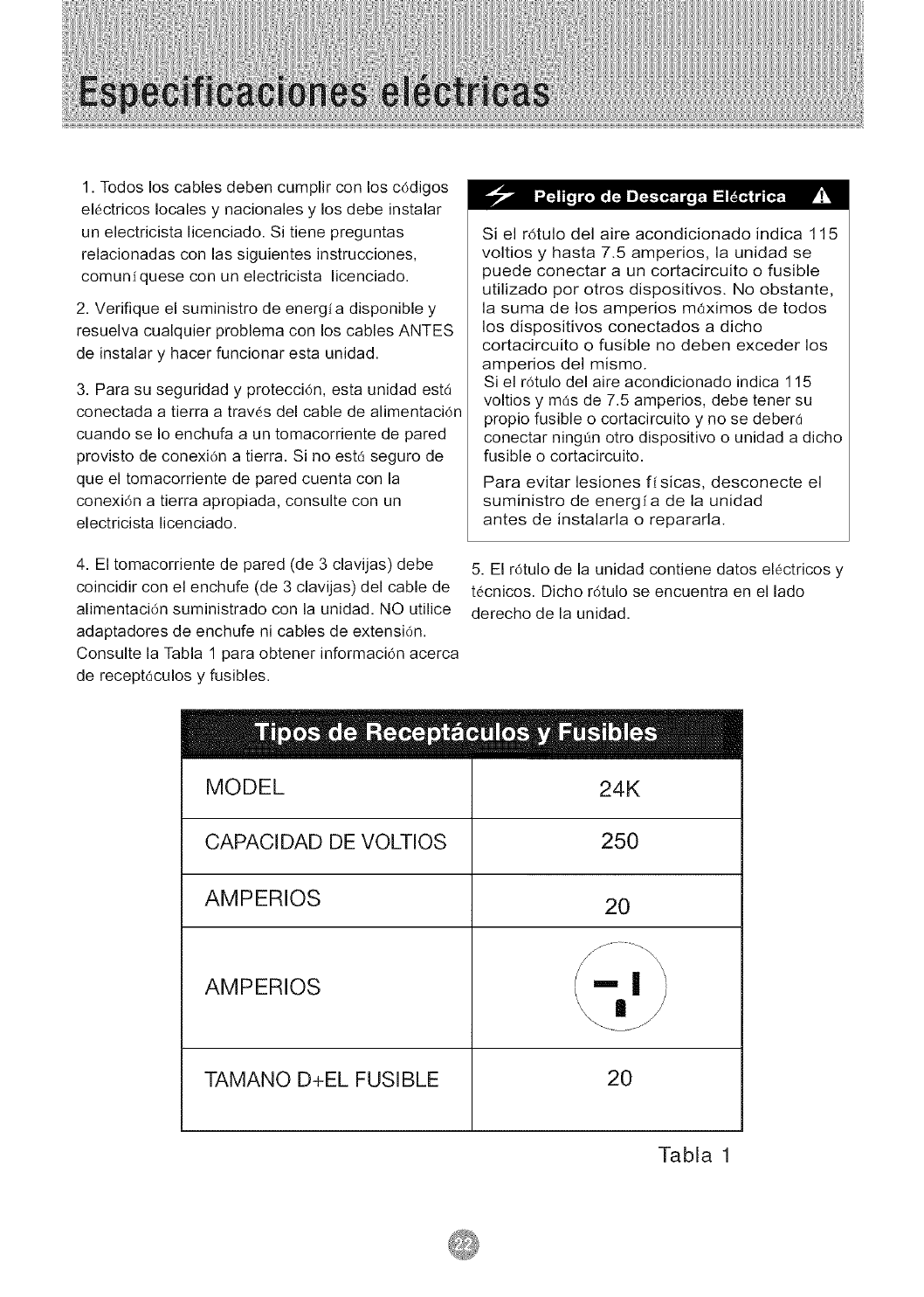 Especificaciones EI6ctricas ..................................... 22