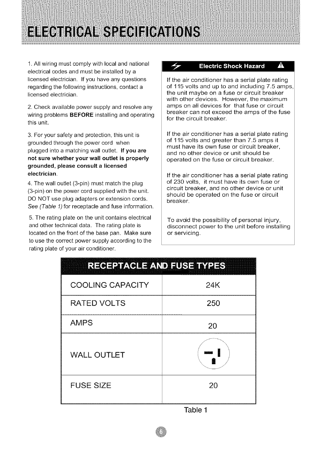 chart on Page 6 (Receptacle and Fuse Types).