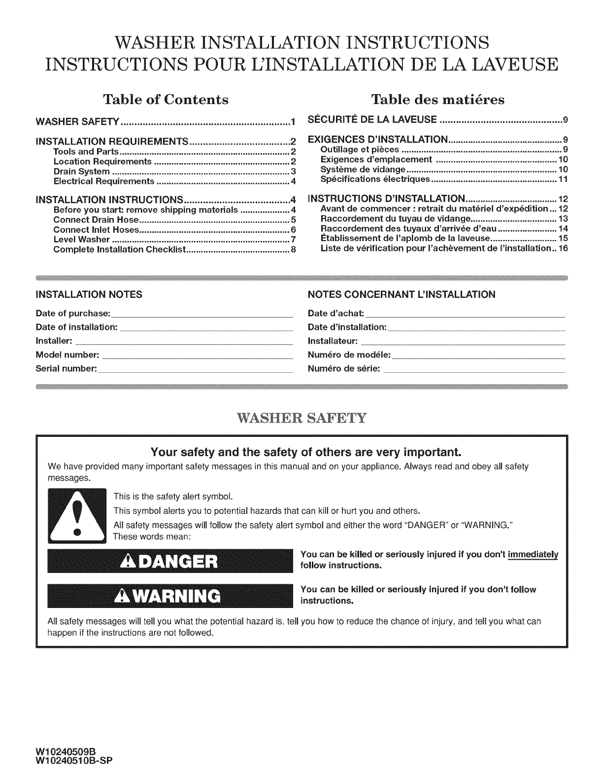 (=tablissement de I'aplomb de la laveuse ........................... 15