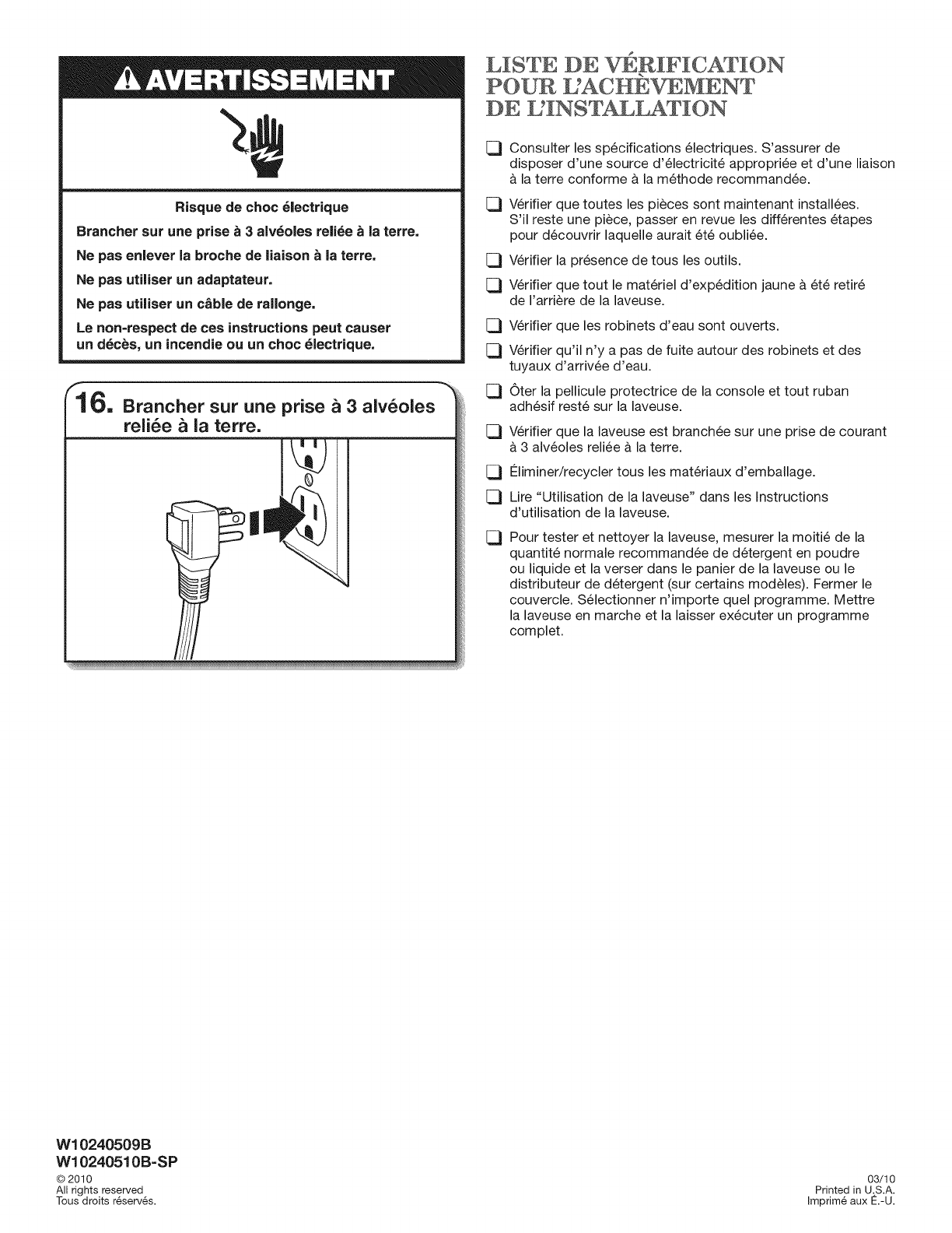 V6rifier que la laveuse est branch6e sur une prise de courant