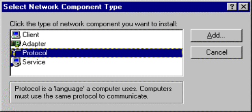4. Double click Protocol to add TCP/IP protocol.