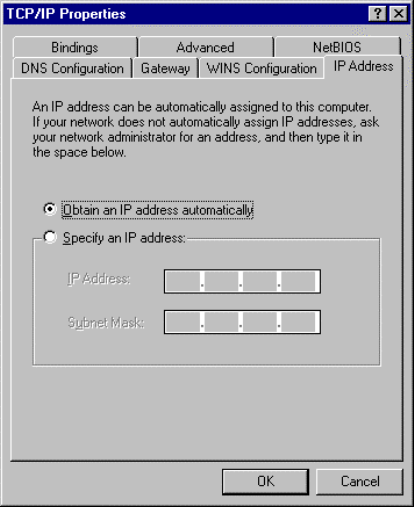 a. Select Obtain an IP address automatically in the IP Address tab.