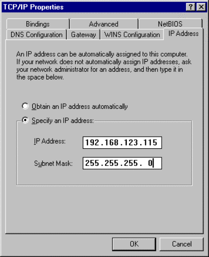 a. Select Specify an IP address in the IP Address tab. The default IP address