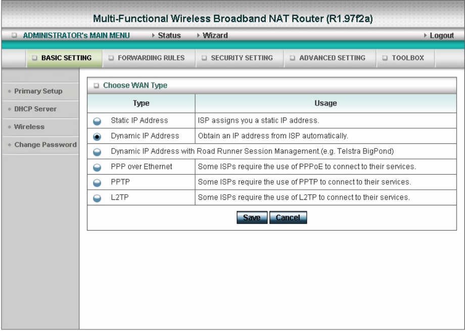 The router supports some WAN types, Static, Dynamic, PPPoE , PPTP ,L2TP, Dynamic IP