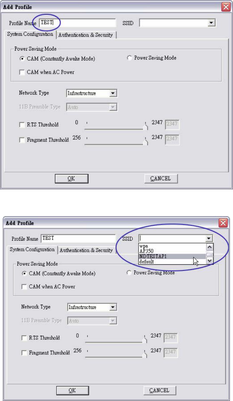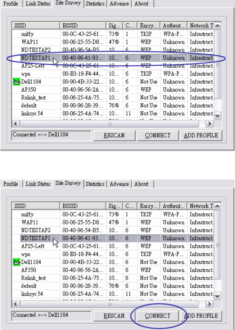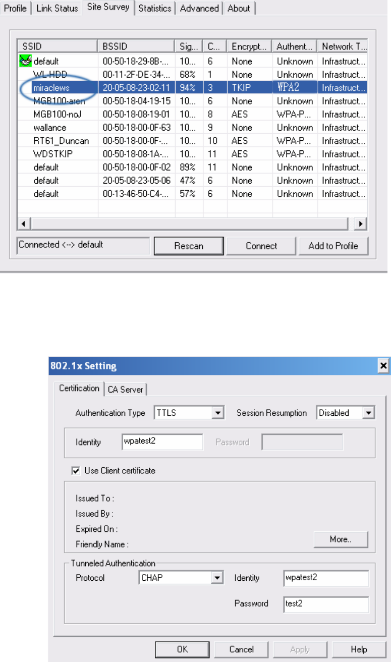 4. Pull down SSID and select one intended AP. The AP list is the result of last site survey.
