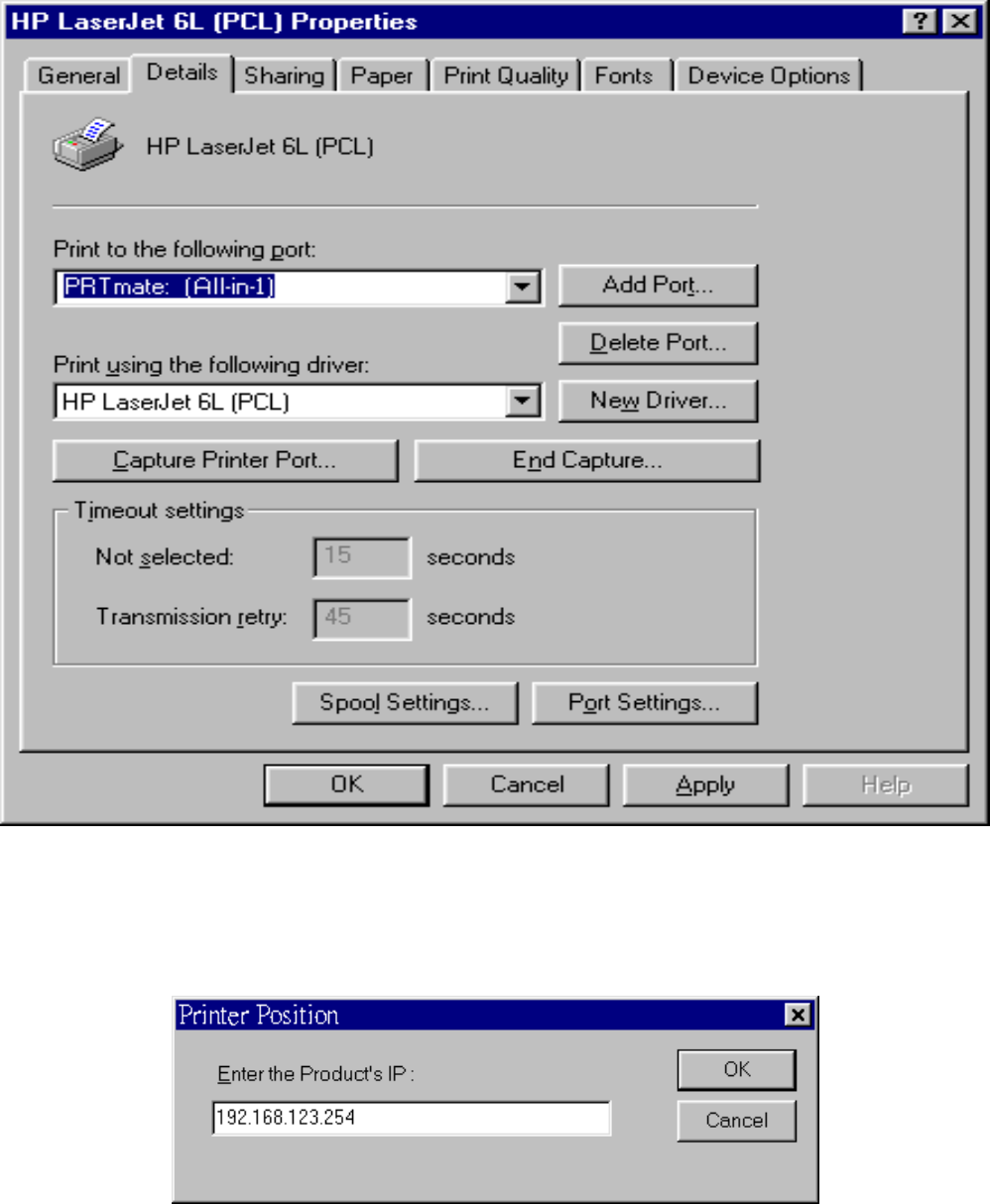 connected to the printer port of this product as server printer. On a Windows 95/98 platform, open the