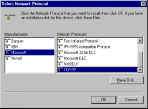 5. Select Microsoft item in the manufactures list. And choose TCP/IP in the Network Protocols.