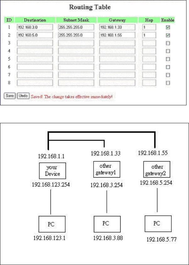 IP address, subnet mask, gateway, hop for each routing rule, and then enable or disable the rule by