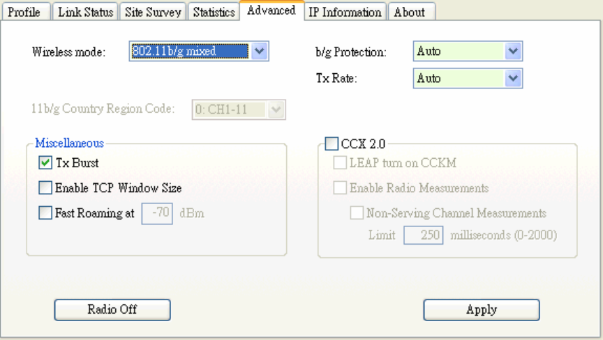 - Wireless mode: Select wireless mode. 802.11b only, 802.11 b/g mixed and 802.11g only modes are supported.