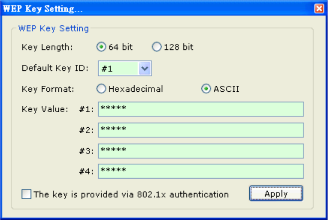 The setting will be worked if the connection encryption was WEP. To launch the setting, click the “WEP Encryption
