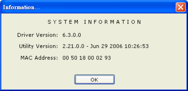 This window shows the driver version, utility version, and MAC address of the wireless adapter.