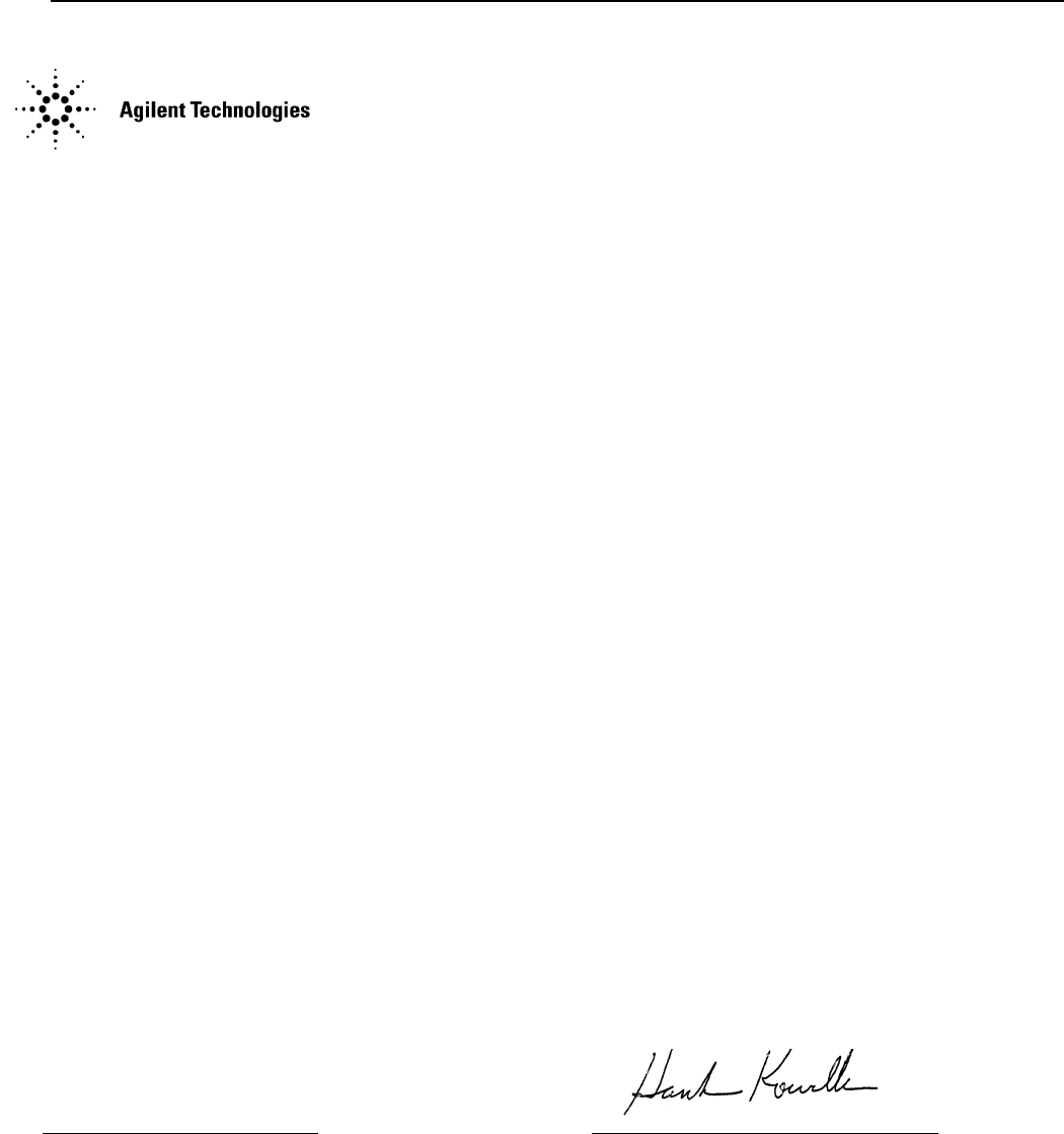 Agilent Technologies certifies that this product met its published specifications at time of shipment from the factory. Agilent