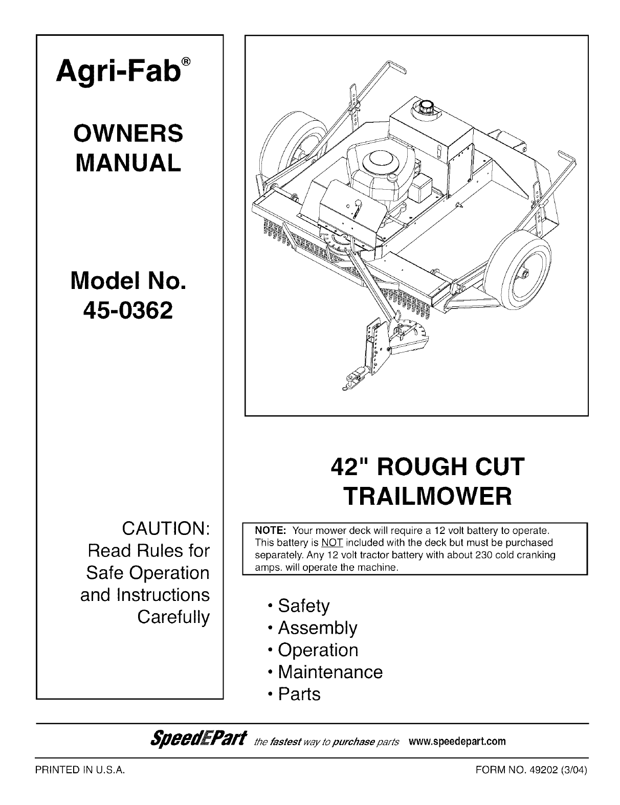 User Manual: Agri-Fab 45-0362 45-0362 AGRI-FAB 42 ROUGH CUT TRAIL MOWER - Manuals and Guides View the owners manual for your AGRI-FAB 42 ROUGH CUT TRAIL MOWER #450362. Home:Lawn & Garden Parts:Agri-Fab Parts:Agri-Fab 42 ROUGH CUT TRAIL MOWER Manual