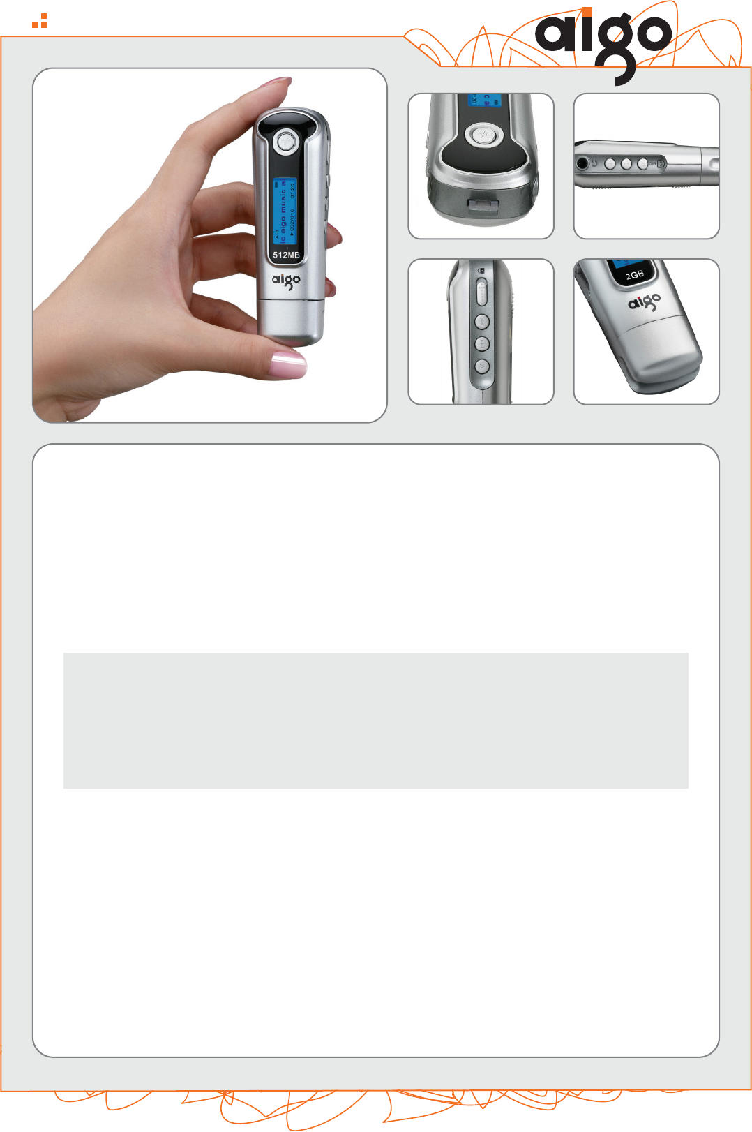 equalizers, and the capability to store any type of data. On top of user friendly features, the Aigo A215 is