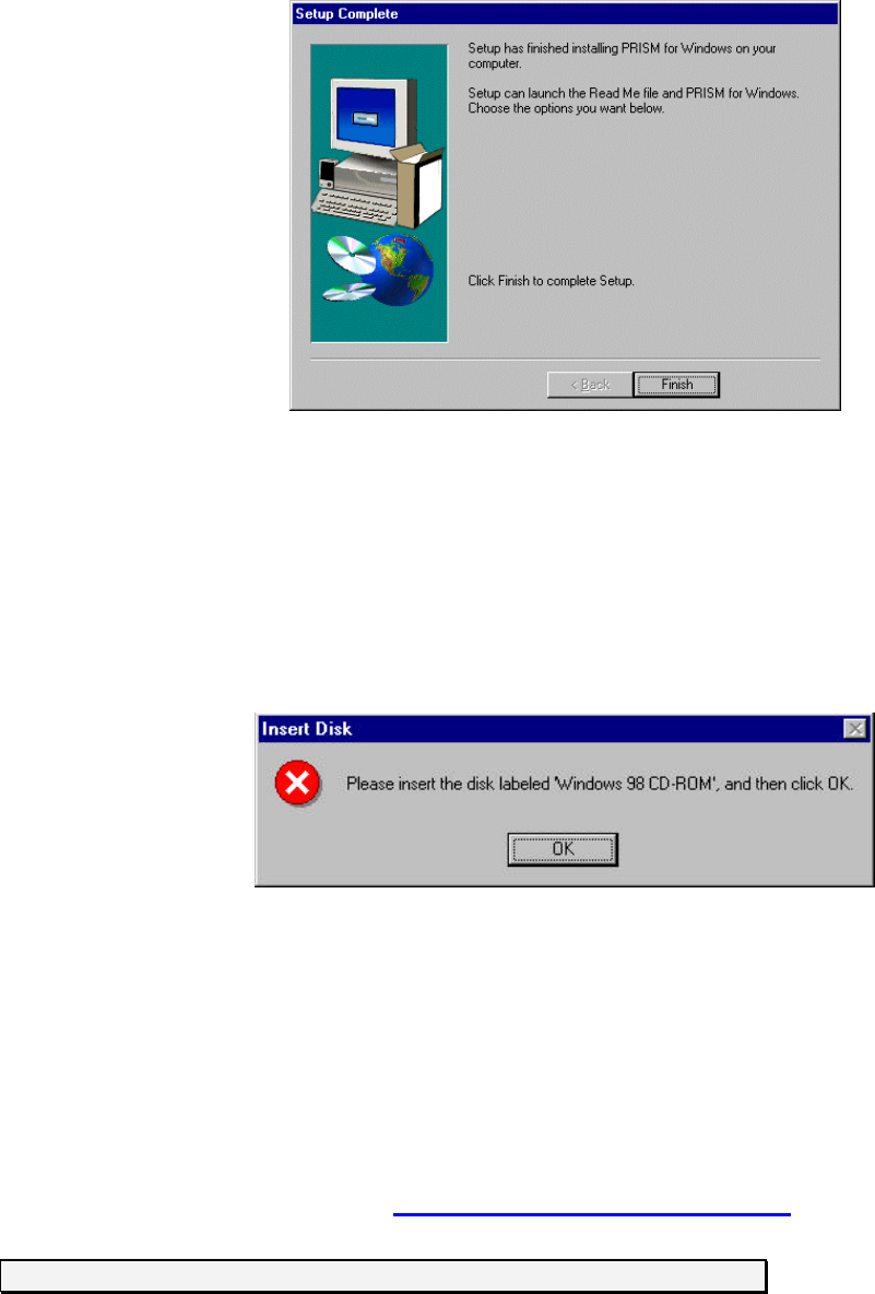 Program dialog box after indicating the Windows to install the required files on the Windows 98