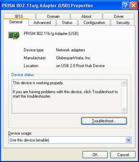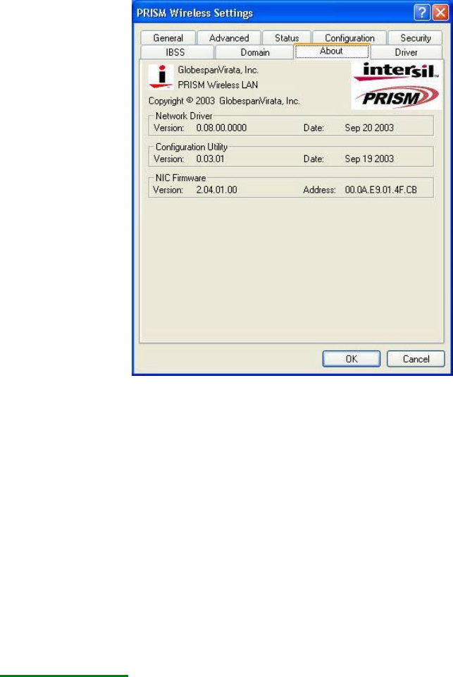 This tab reveals brief information on the 802.11 g/b WLAN USB Stick device itself.