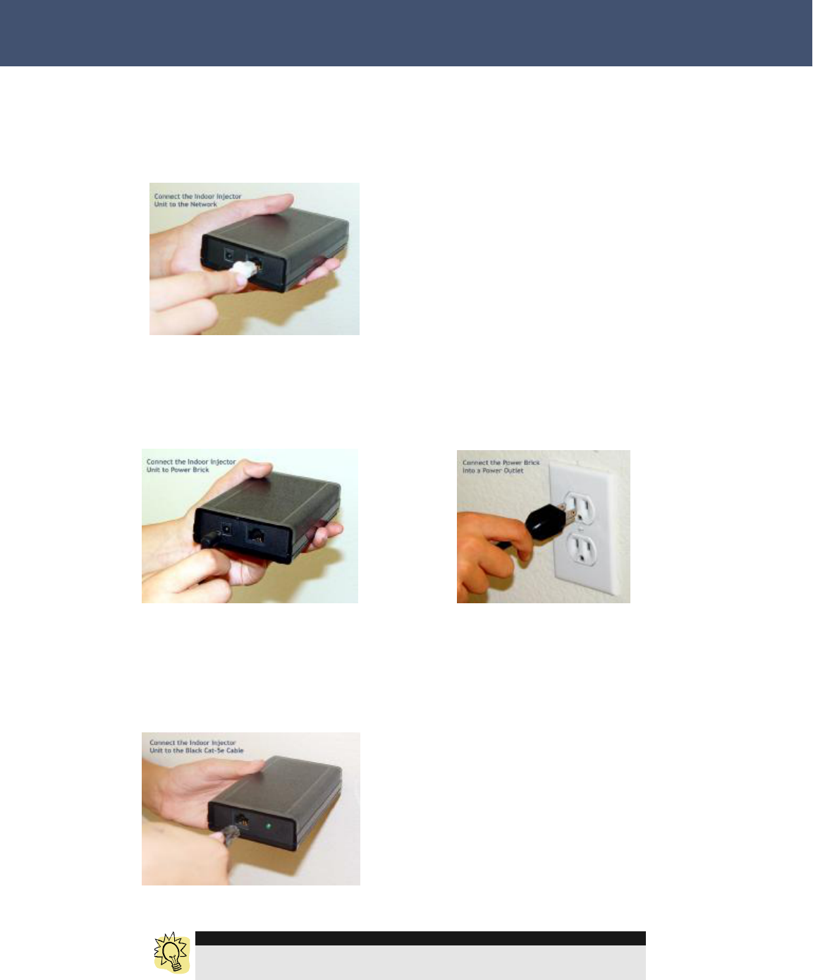 - Verify all physical connections. You should have an Ethernet link light on the