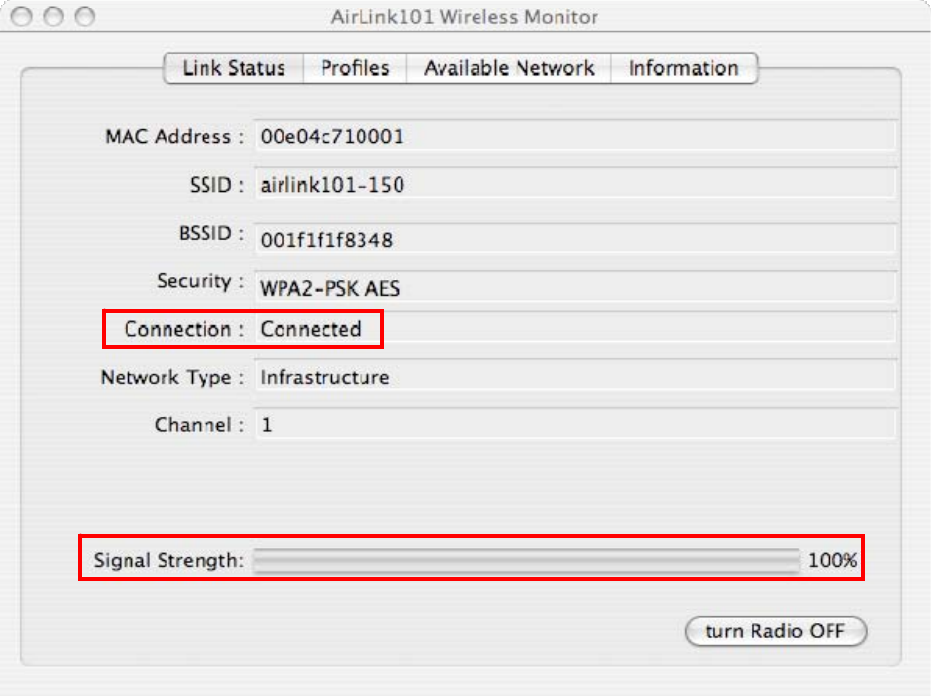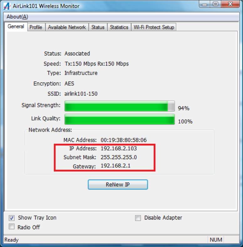 under “Link Status” tab. The Connection should be Connected, and there should be a
