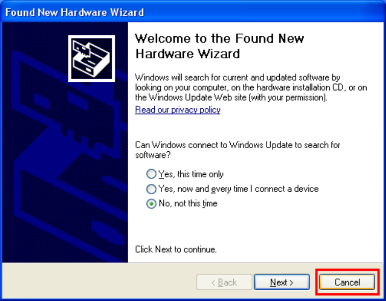 Step 2.2 Click Cancel when you see the Found New Hardware Wizard.