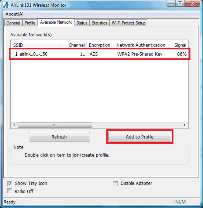 Step 4 Click the Available Network tab, select the SSID (Network Name) of the
