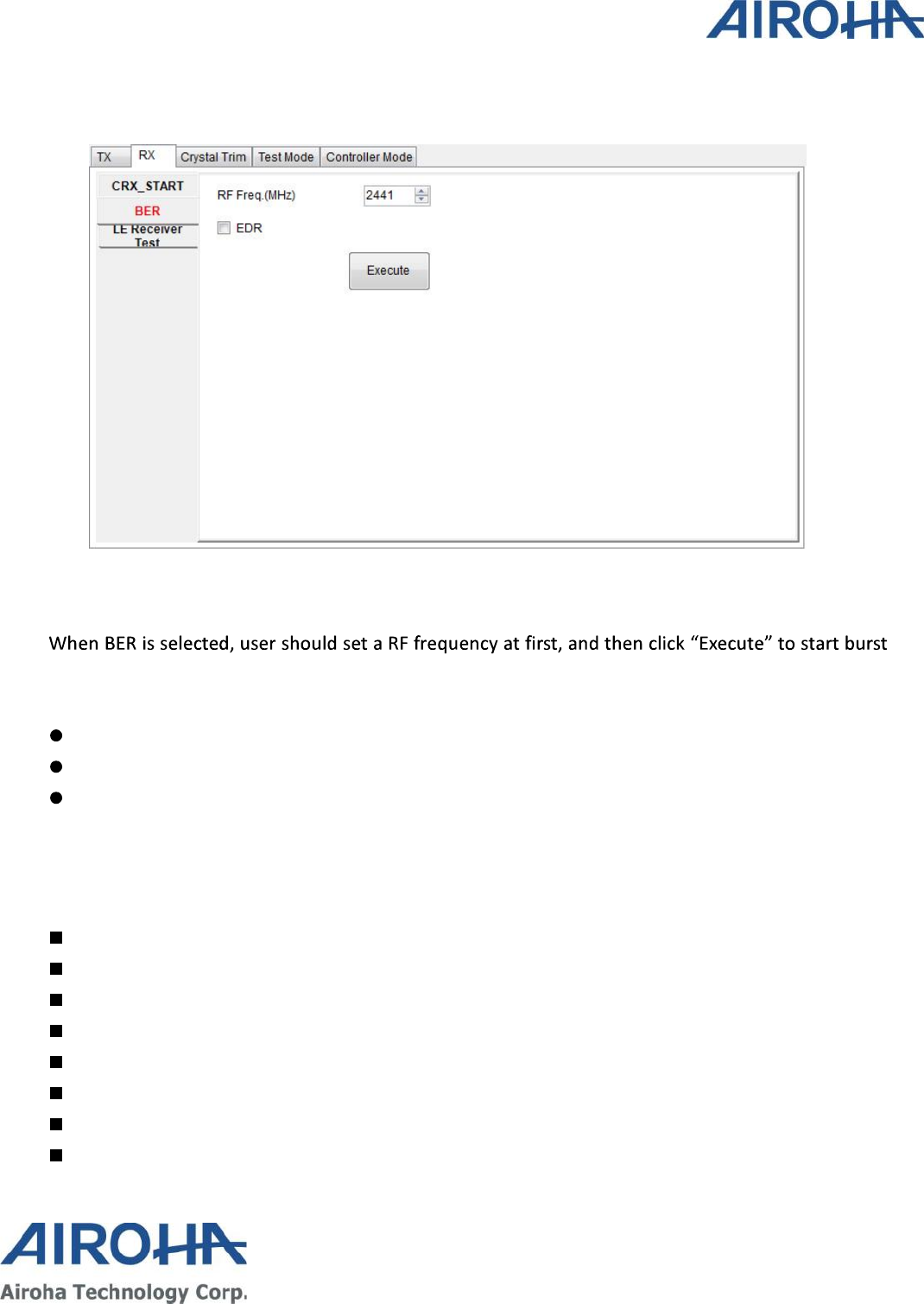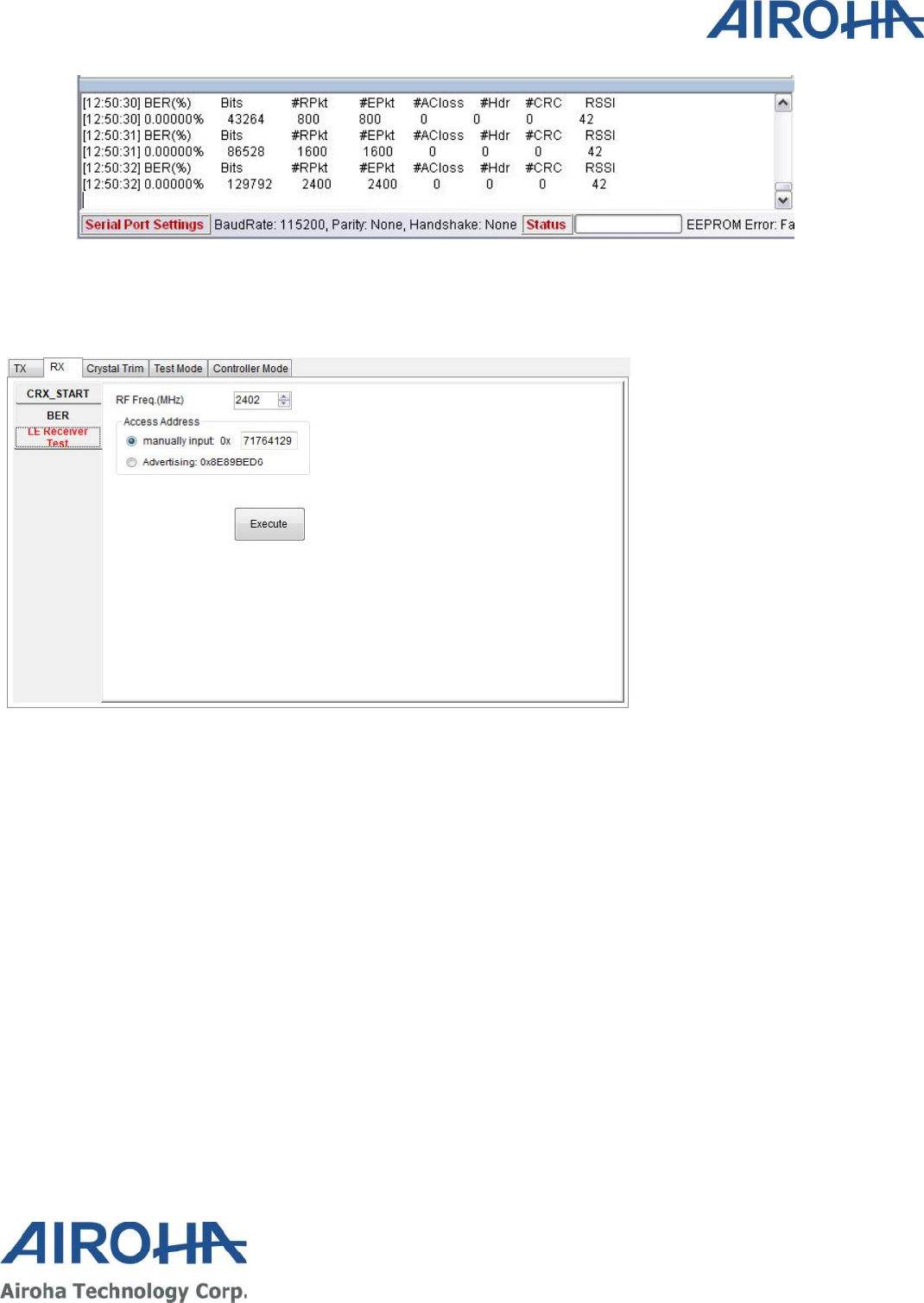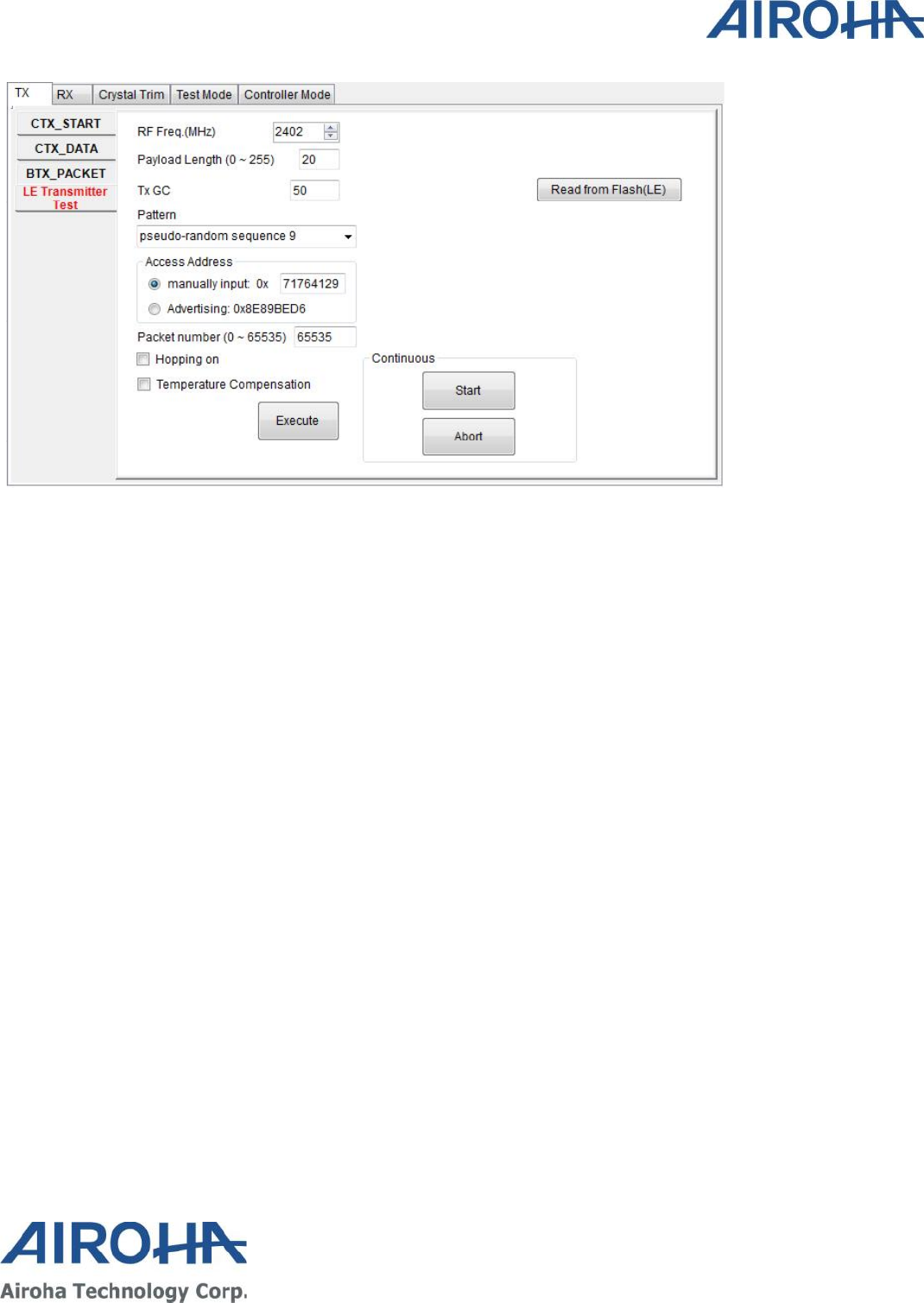 to perform continuous TX, Burst TX, RX BER and Crystal Clock Trimming to test Airoha AB1602 Family