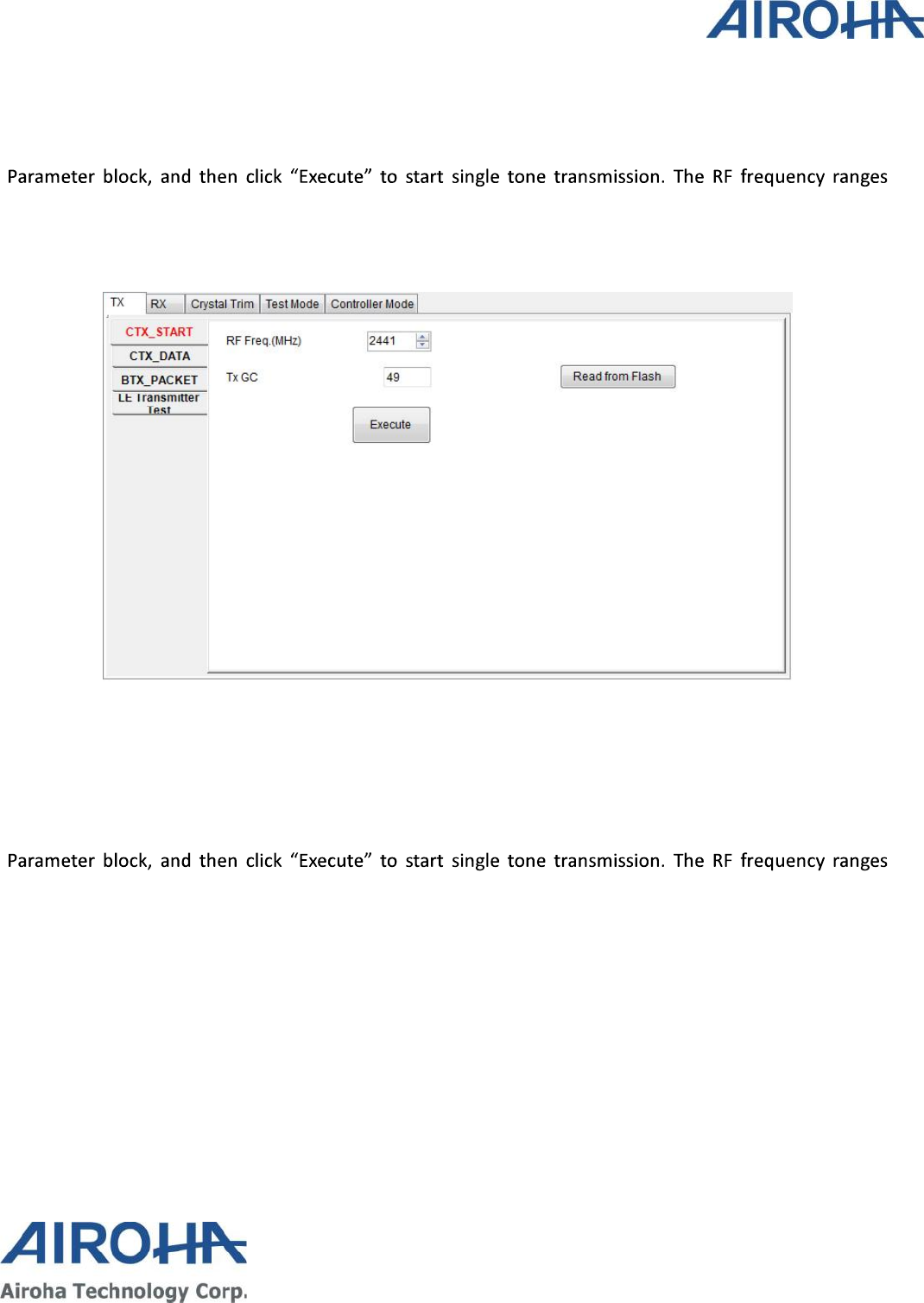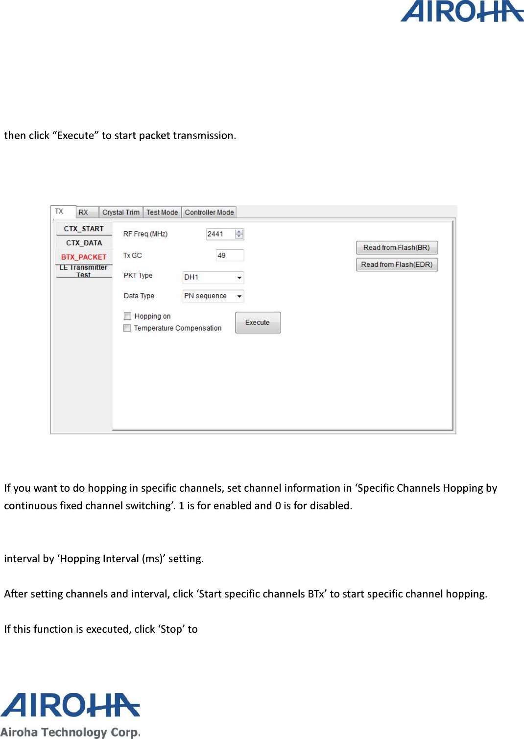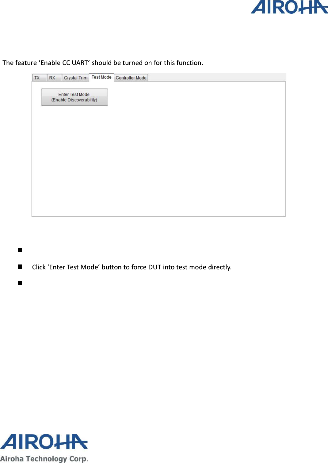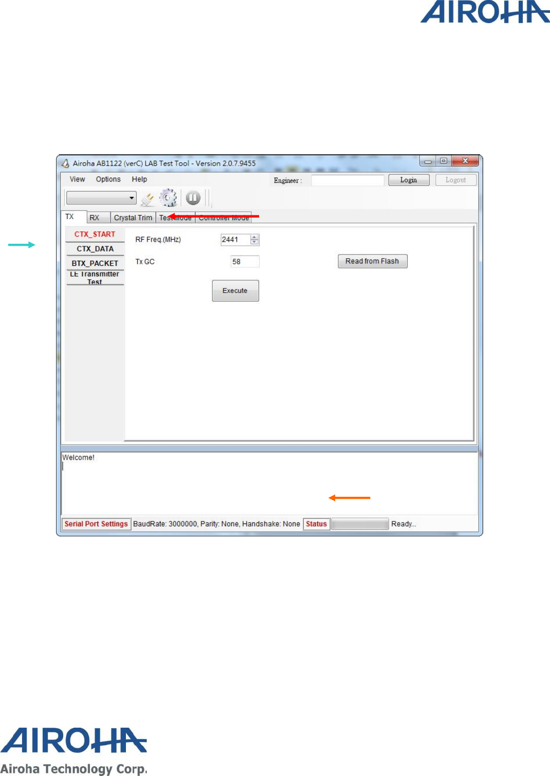 to perform continuous TX, Burst TX, RX BER and Crystal Clock Trimming to test Airoha AB1602 Family