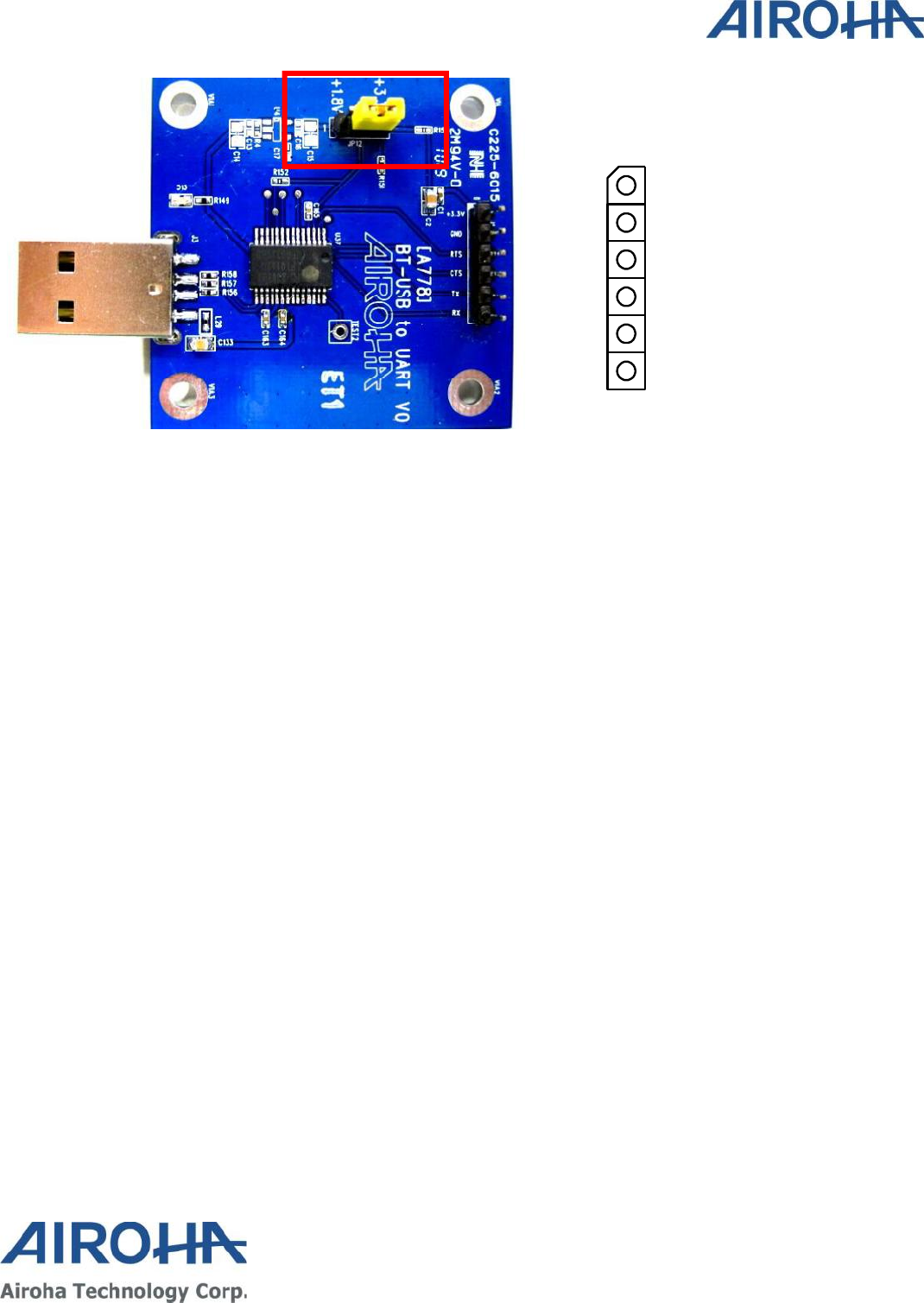 If an USB-to-UART adaptor made by Airoha is used (as in Figure 2-2), the J1 connector (to DUT) pin