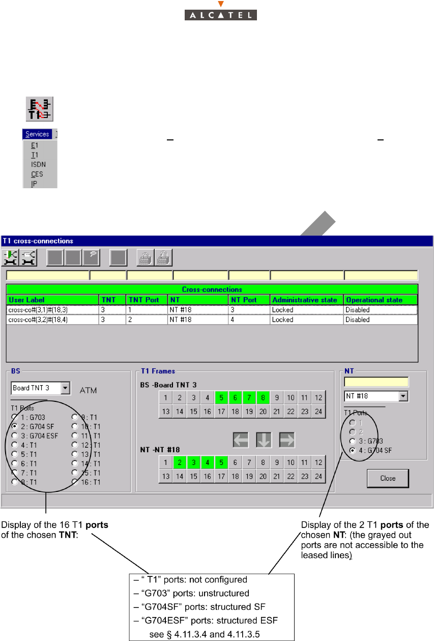 A T1 cross-connection is a link between a TNT board of the BS linked to the TDM network (or ATM if