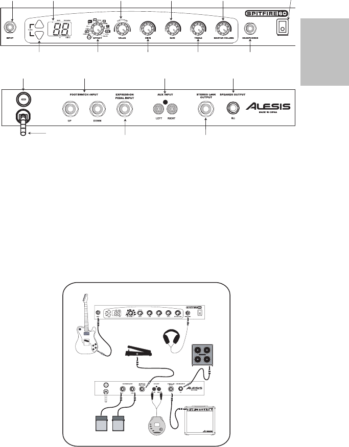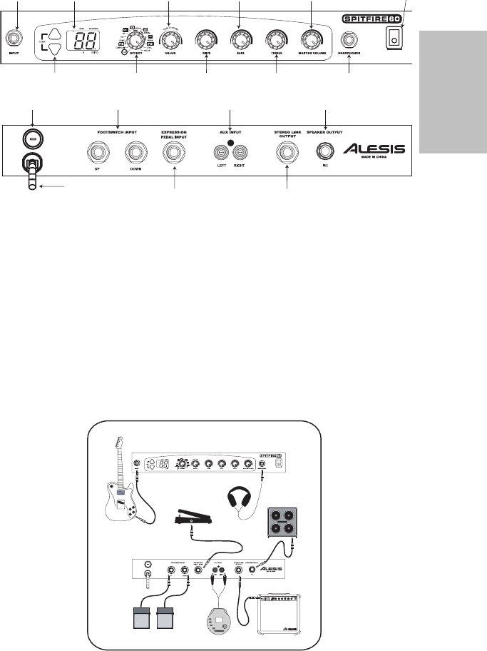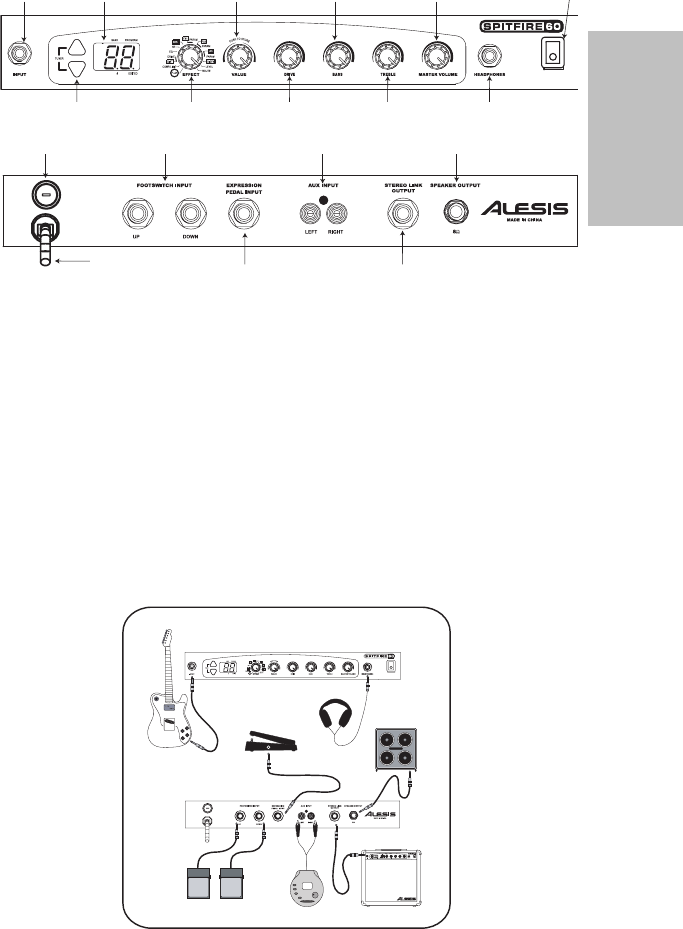 5. Connect your guitar and other equipment to the Spitfire in the manner illustrated below. Refer to the