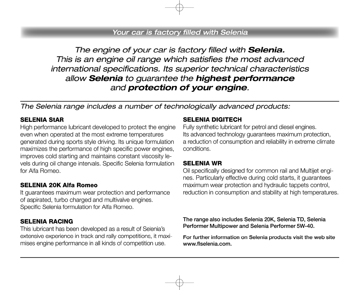 The Warranty Booklet also containes the regulations, the warranty certificate and a guide to the services offered by Alfa Romeo.