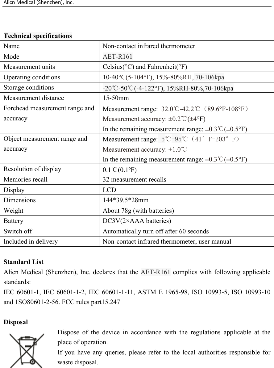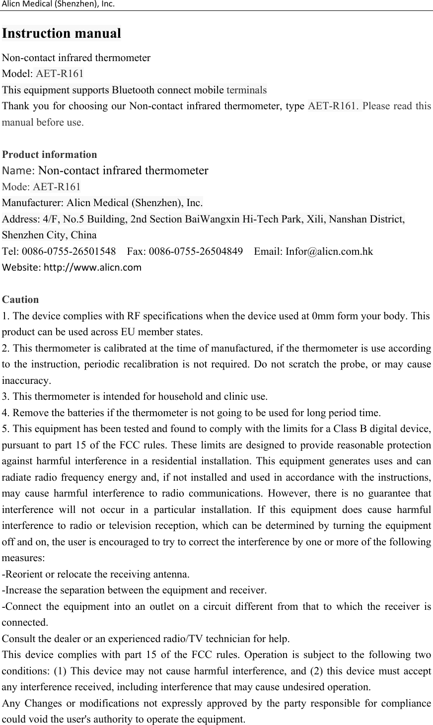 Alicn Medical R161 Non-contact infrared thermometer User Manual