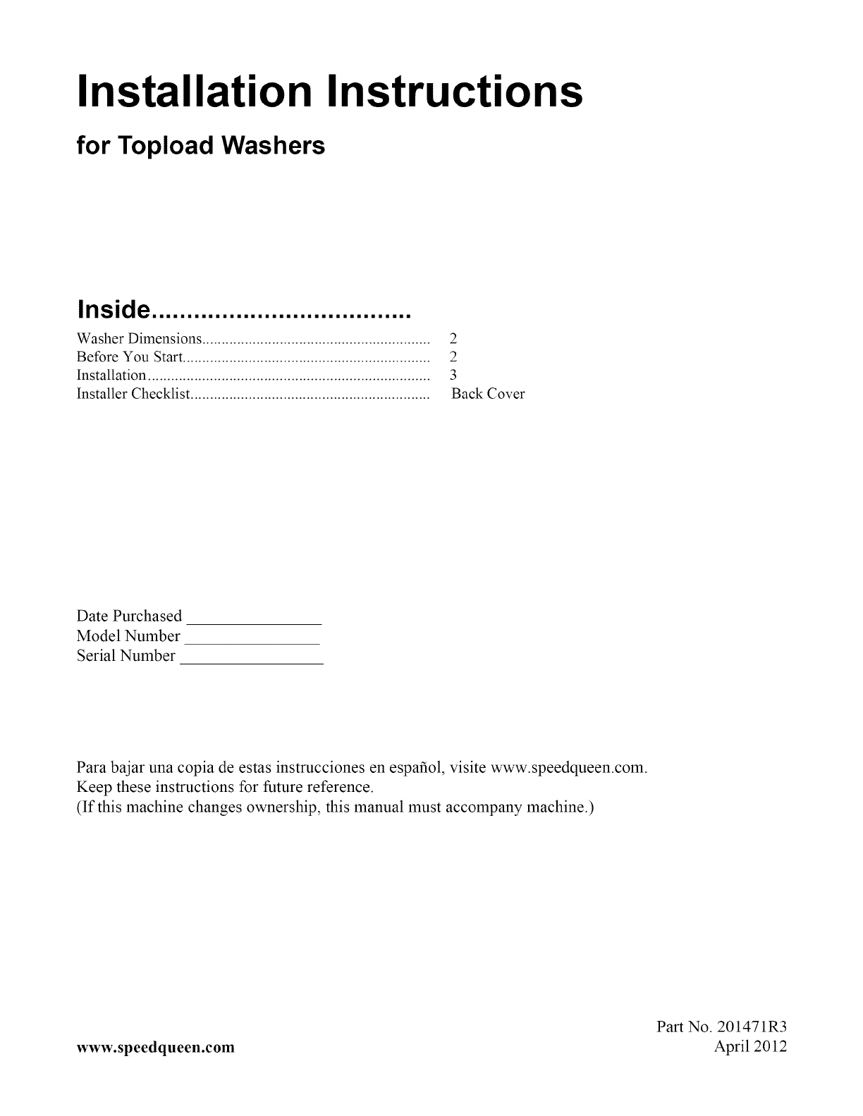 Para bajar una copia de estas instrucciones en espafiol, visite www.speedqueen.com.
