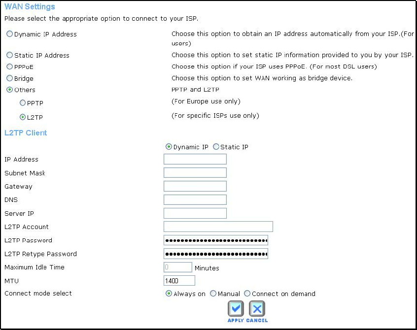 Configure the L2TP connection and click the Apply button to put the new settings into effect.