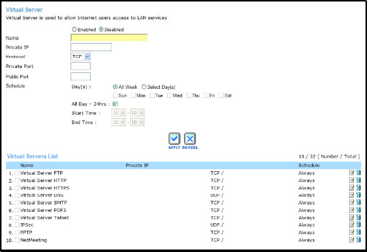Configure the PPTP connection and click the Apply button to put the new settings into effect.