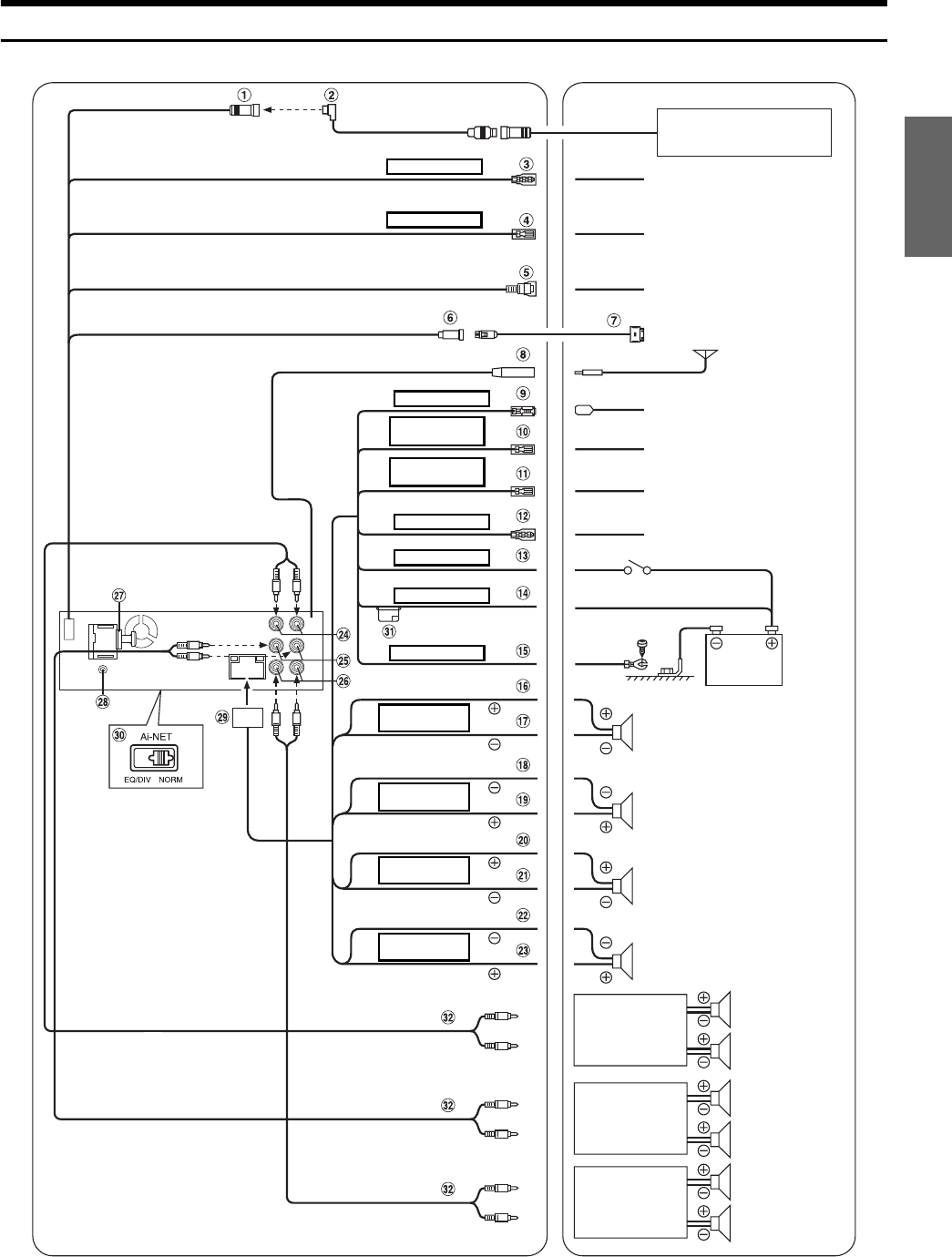• If you add an optional noise suppressor, connect it as far away from the unit as possible. Your Alpine dealer carries various noise