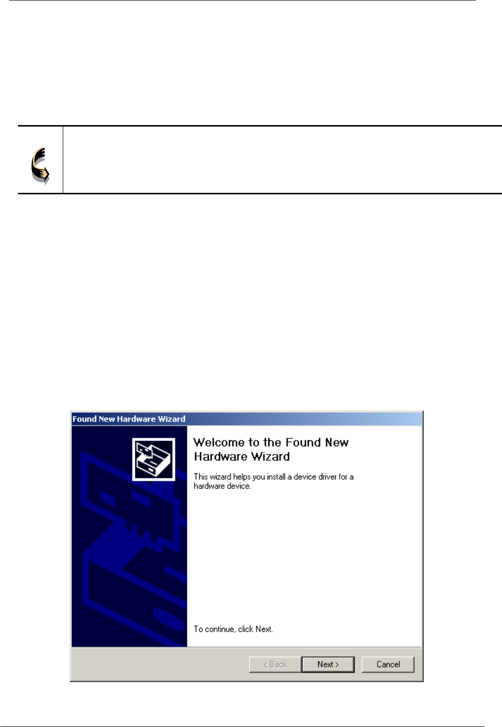 New Hardware Wizard window appears. Click Next to start the installation.