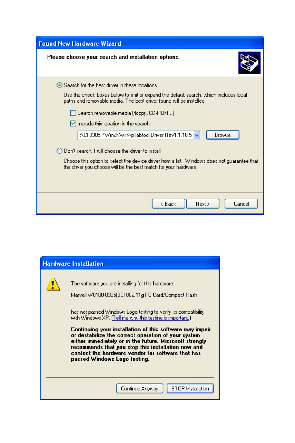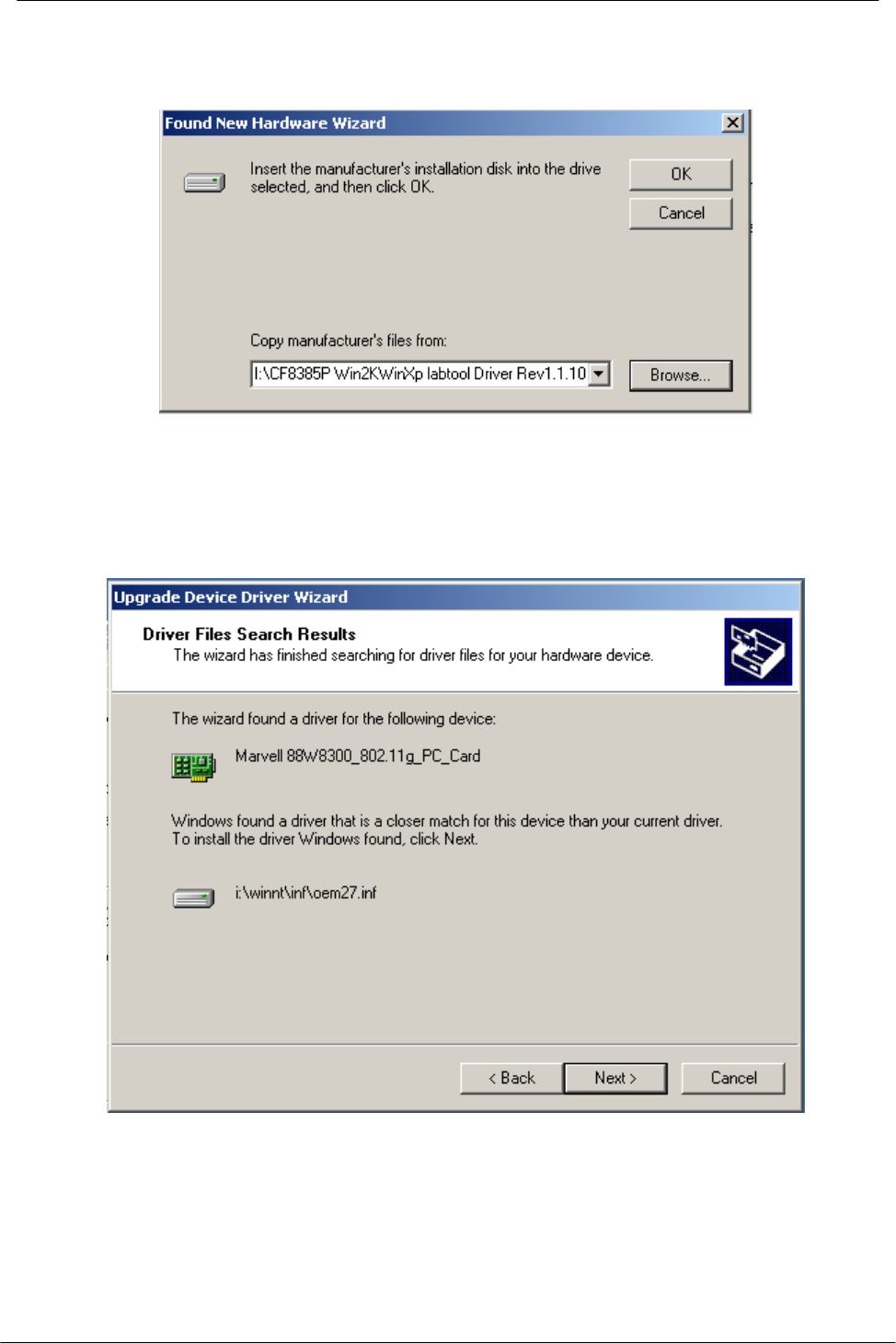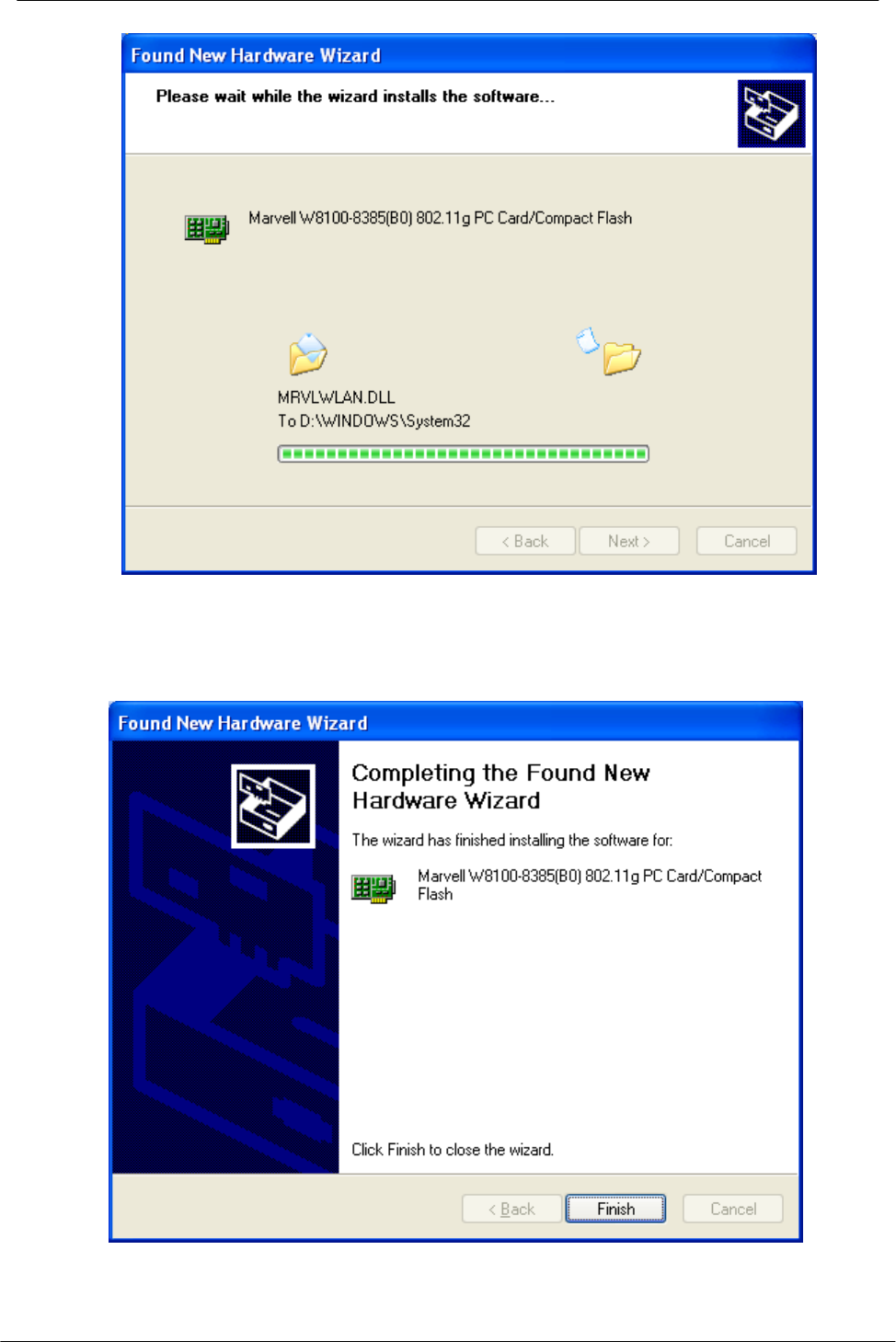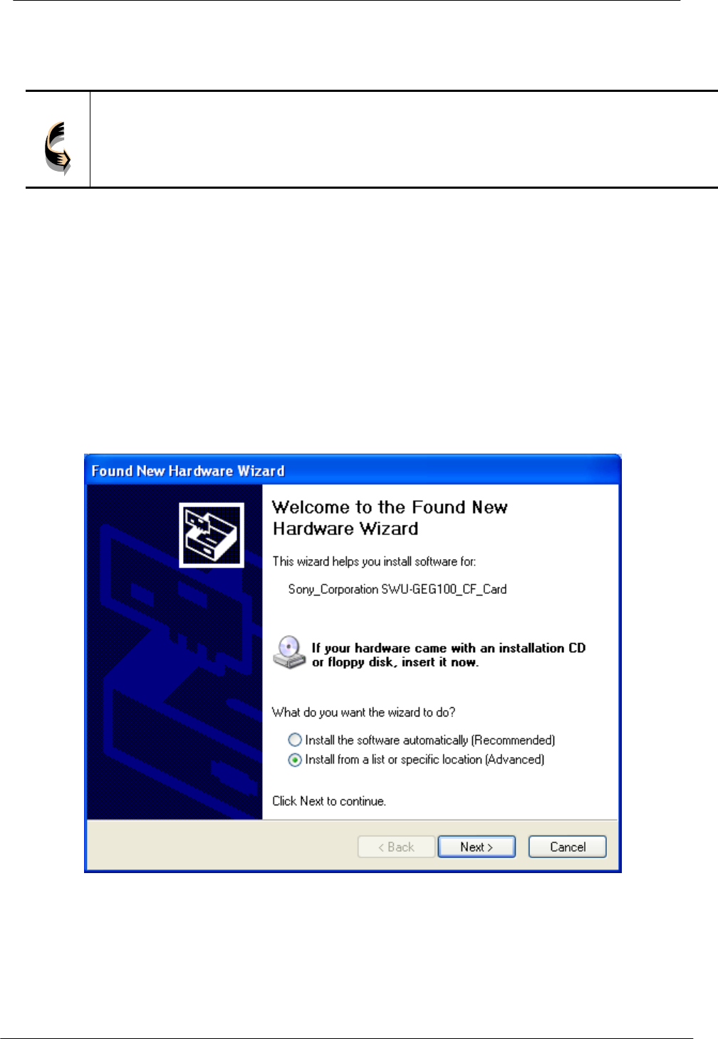 2. After Windows XP detects the WL54-CF, the Found New Hardware Wizard window
