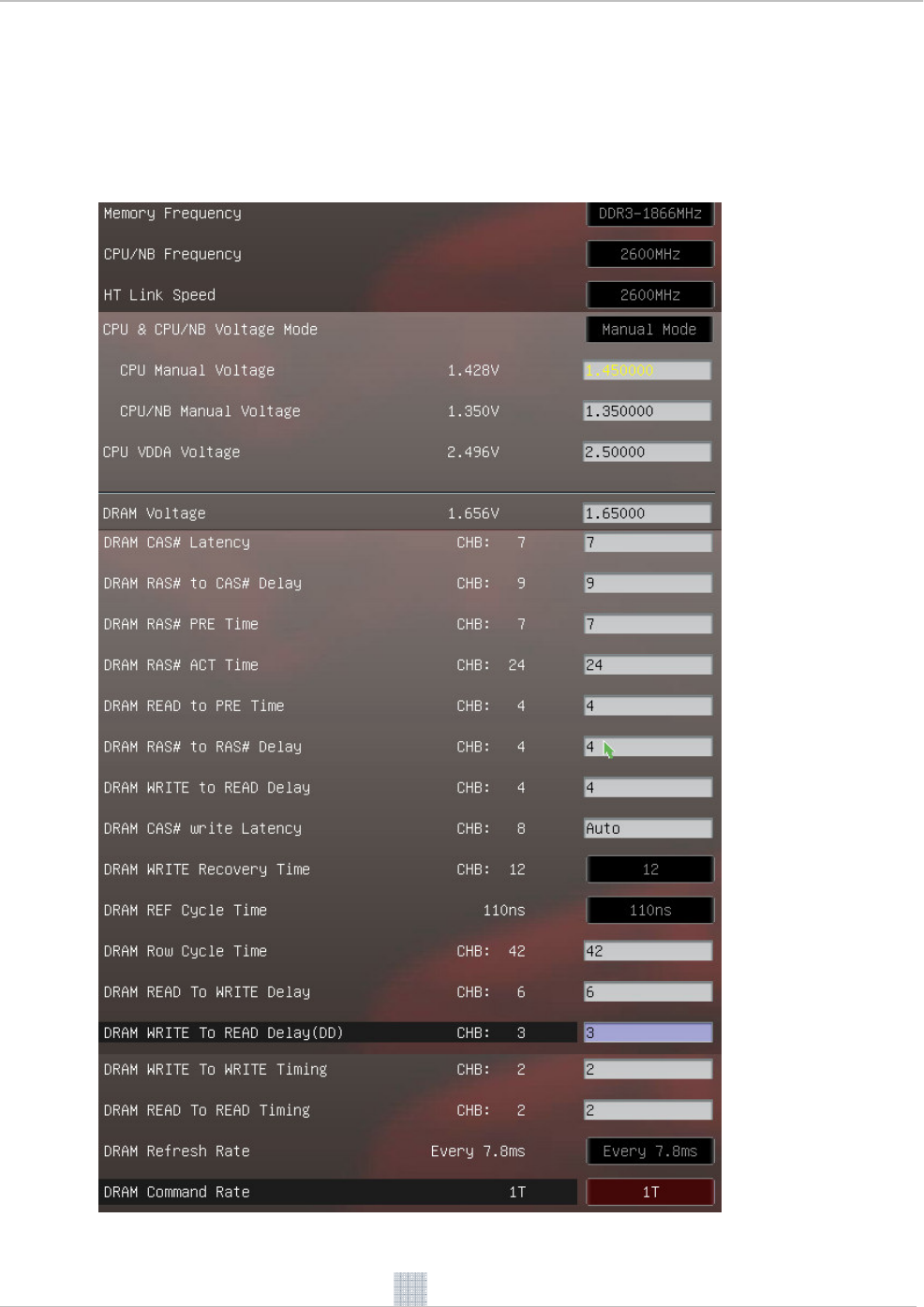 Figure 9: Example settings for DDR3-1866 memory clock mode (2 DIMMs, one DIMM per channel)