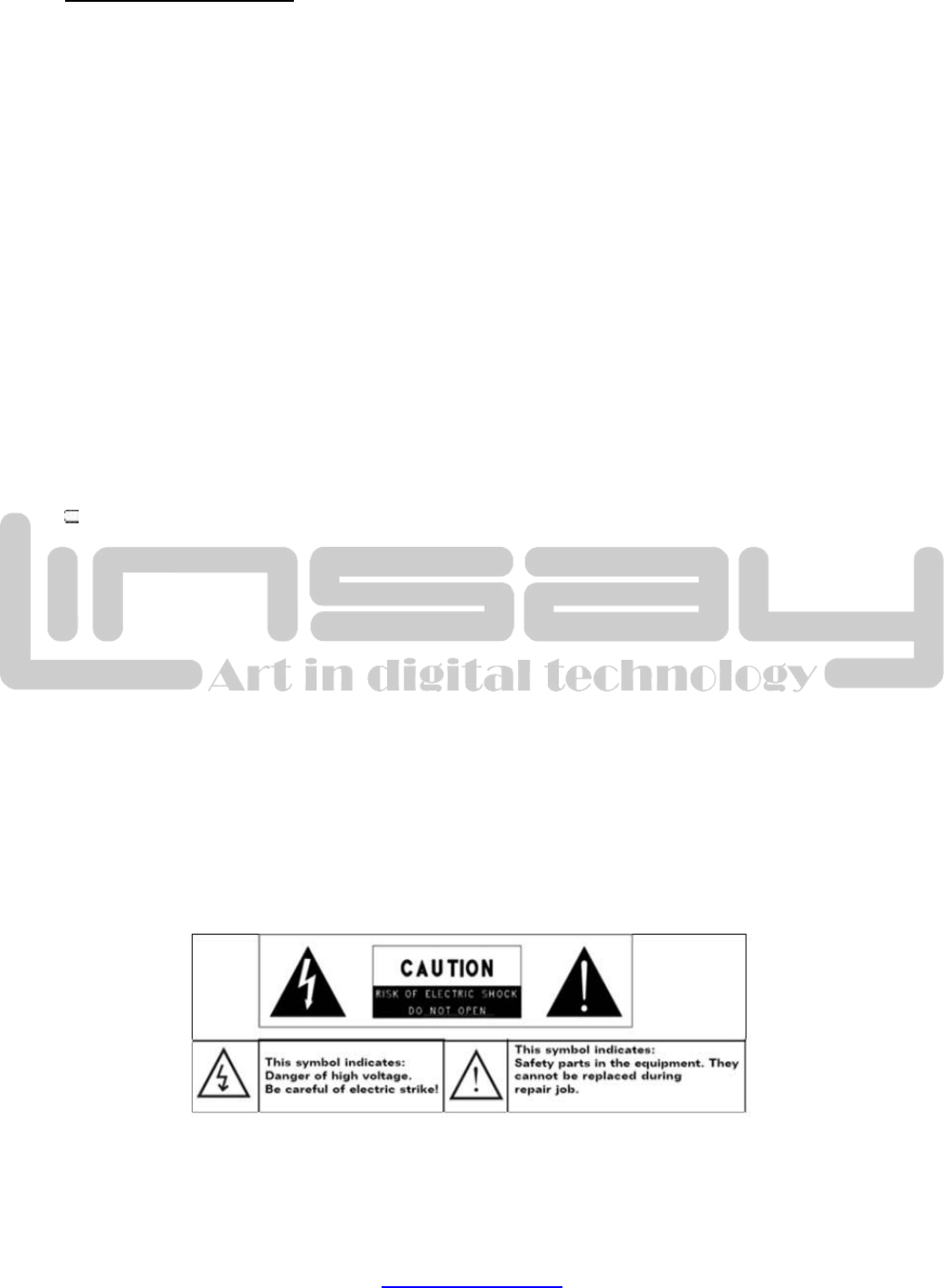 • -To reduce the risk of electric shock, do not remove the cover (or back) as there are no user-serviceable parts inside. Refer servicing to qualified
