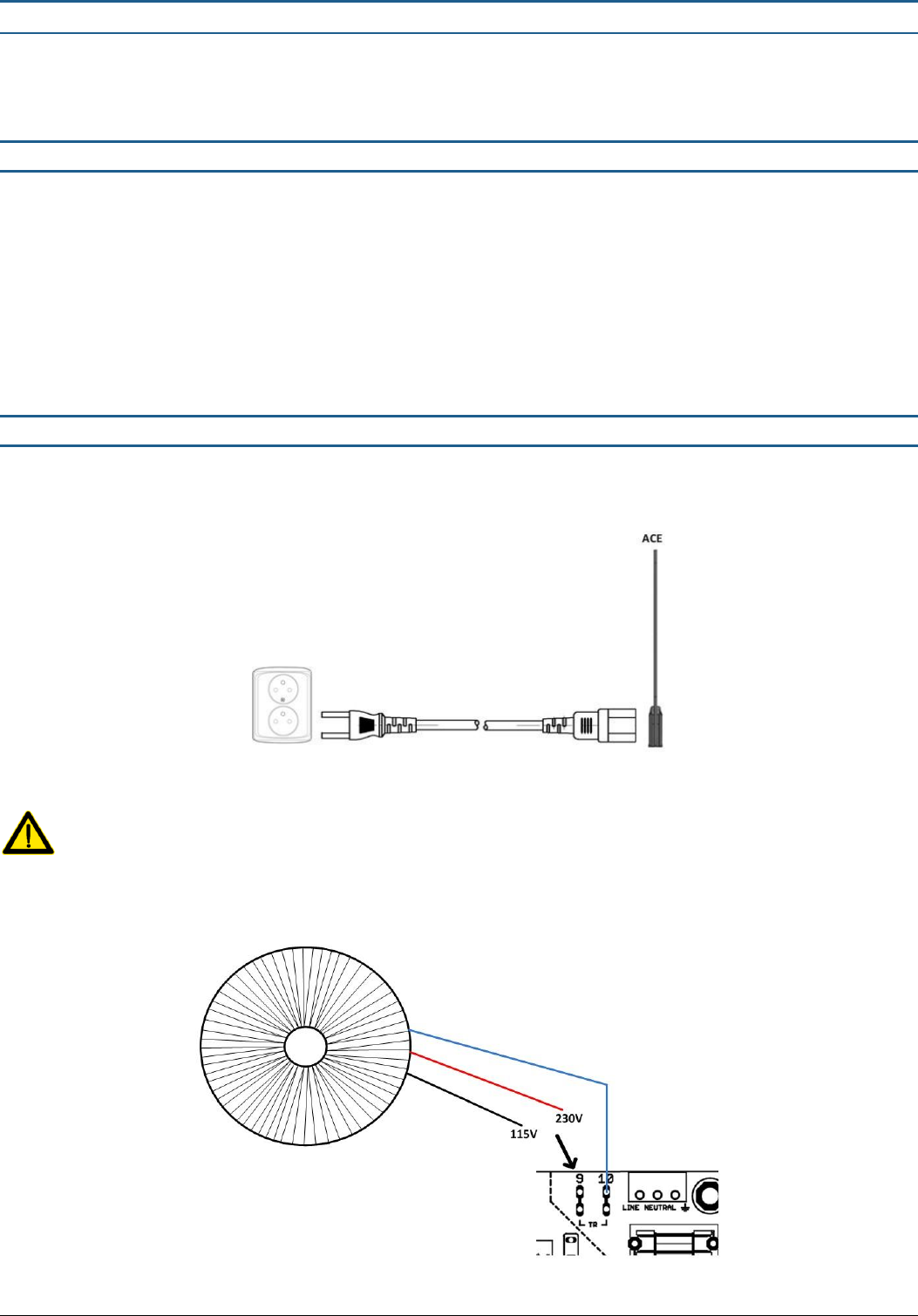 Connect the power cord to the ACE system BEFORE you connect to the mains power outlet! DO NOT disconnect the