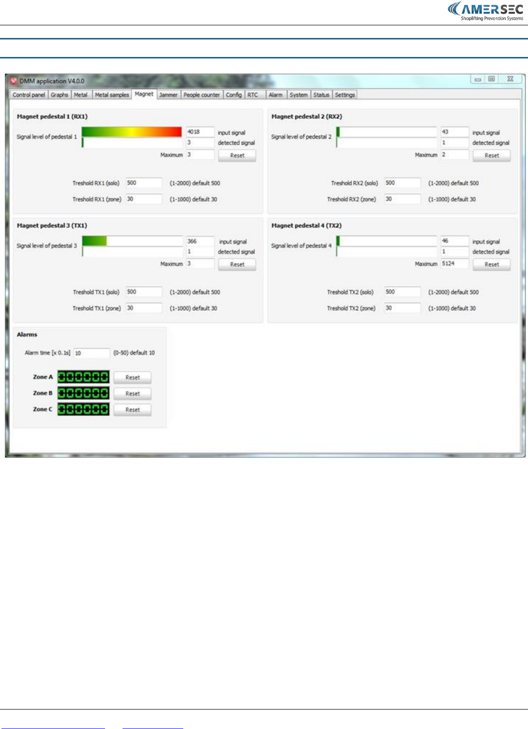Threshold (zone): Alarm threshold for 2 pedestals, operating together. Decrease this value to make the system