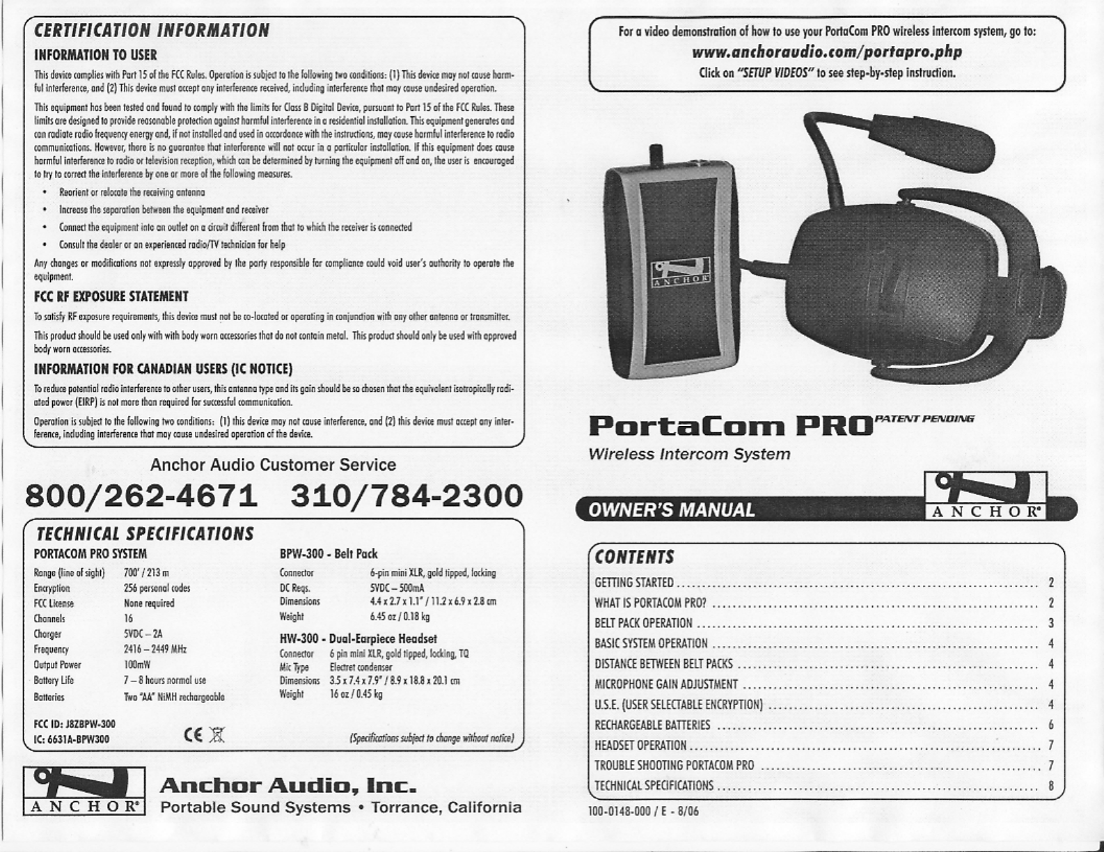 Anchor Audio BPW-300 2.4GHz Wireless Intercom User Manual
